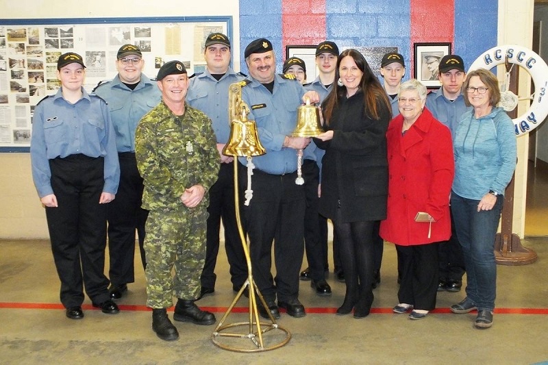 TRAIL – The City of Trail’s new museum is now in possession of the authentic HMCS Trail Ship’s Bell. The Trail's Bell is officially held by Trail's Sea Cadet Corps - 131 Kootenay RCSCC - and is on loan to the city by the Canadian Armed Forces. Several months ago, the Trail Historical Society enquired about the possibility of having the bell for its new museum, after having found old newspaper articles featuring the ship's bell. An agreement was made between the city and the local branch of the Canadian Armed Forces, that the bell would be on extended loan, and a replica bell, with the Cadet Corps' identifying number would be provided to the Cadets to use. The ship's bell is integral to the life onboard any ship, as sailors mark time using the ship's bell since the sound can cut through even the loudest noises onboard, and each Sea Cadet Corps in Canada holds at least one. "The City of Trail used to be quite a booming place in the early part of the 1900's," said Sarah Benson-Lord, city representative to the Trail Historical Society. "It's quite extraordinary for us to have a naval ship named after our little city, so we were really hoping everything would work out for us to be able to complete our display." After several months of research and many emails back and forth to different vendors, the replica bell was finally obtained and the exchange was made earlier this month at the Trail Armoury. Attending the event were several members of the Trail Historical Society, the Sea Cadets, and Chief Warrant Officer Sharman Thomas. "We are proud to have been able to do this for the city," said Chief Petty Officer Second Class Naomi Savage. "And it's really nice that they were able to provide us with our 'own' bell. I like that the replica says our Corps name on it." The HMCS Trail bell is now on display at the Riverfront Centre in Trail, and a formal presentation ceremony is planned for the near future.