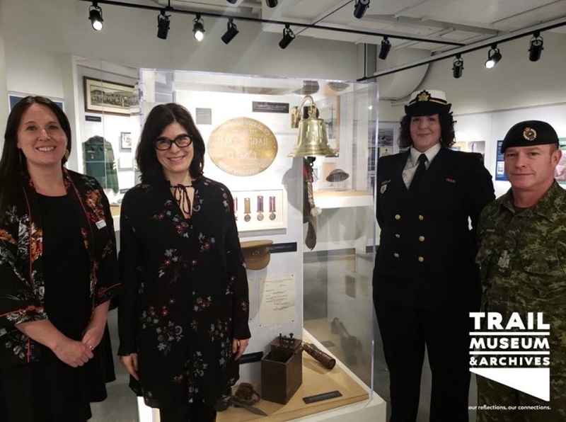 The Trail Museum & Archives recently installed the HMCS Trail ships bell in the History Gallery. The bell is generously on loan to the City from the RCSCC 131 Kootenay Sea Cadets. Pictured here are Museum & Archives Manager Sarah Benson-Lord, Mayor Lisa Pasin, Lt(N) Llora McTeer and Chief Warrant Officer Sharman Thomas. We thank the Sea Cadets for sharing this remarkable piece of Second World War history!