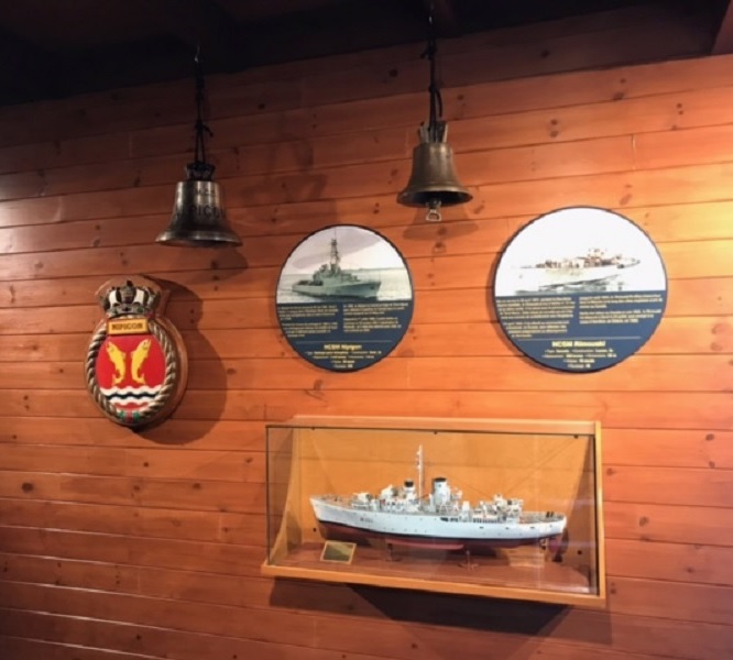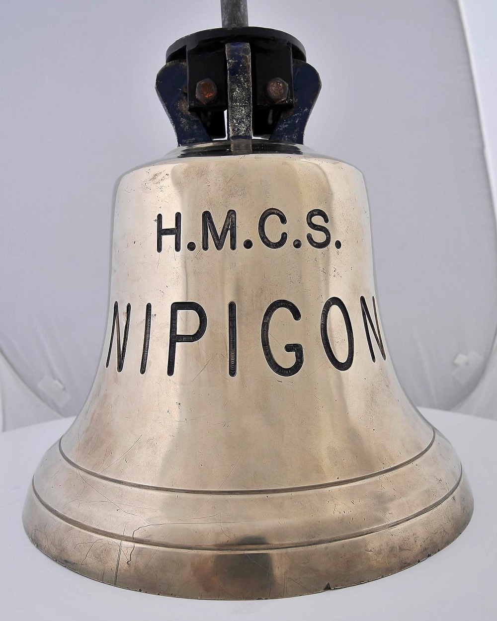 The bell and badge of HMCS NIPIGON 266 (left) are on display on the wall at the Welcome Centre of the ONONDAGA Museum (former HMCS ONONDAGA) located at Pointe-au-Père, Rimouski, Québec. NIPIGON was scuttled on 22 Jul  2003 to become an artificial reef just a few kilometers away from Pointe-au-Père.