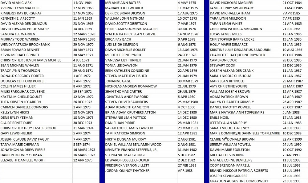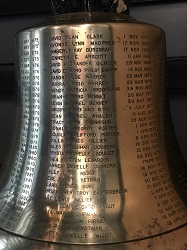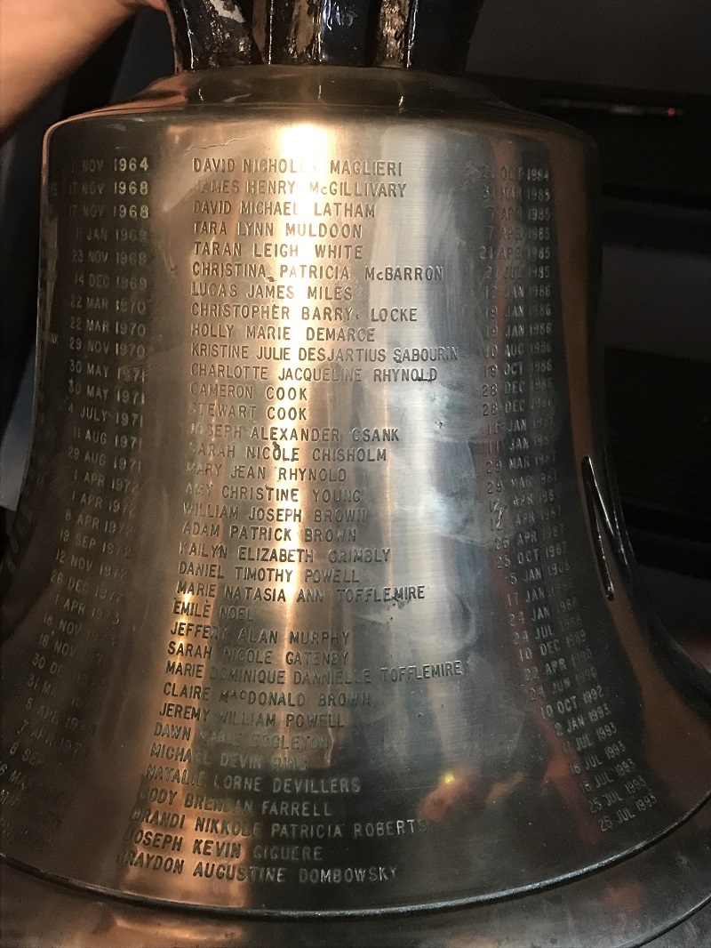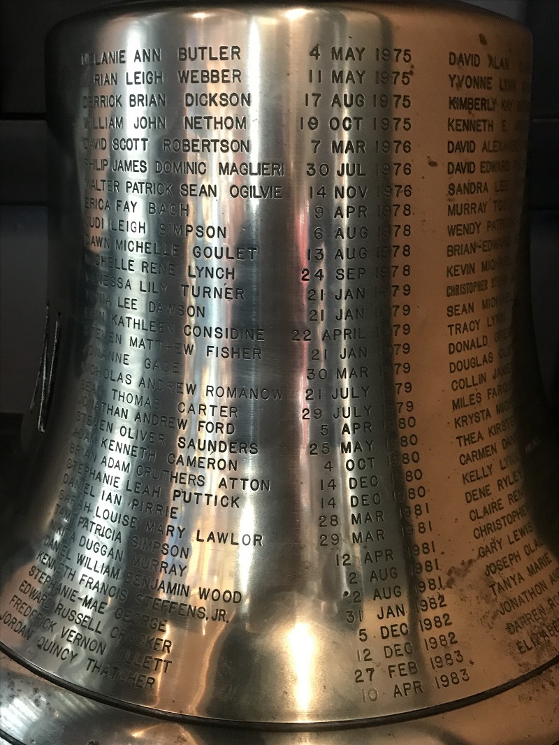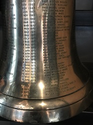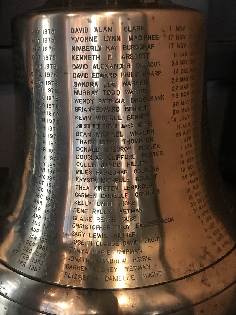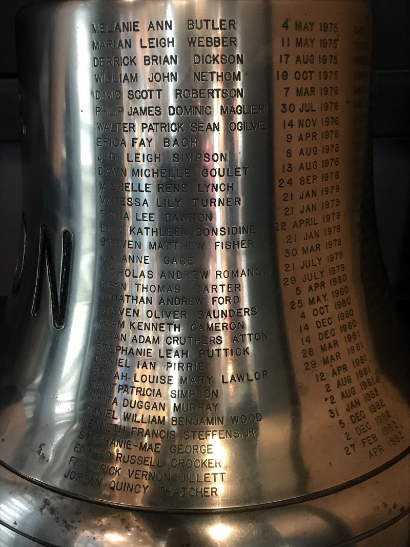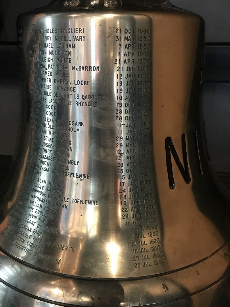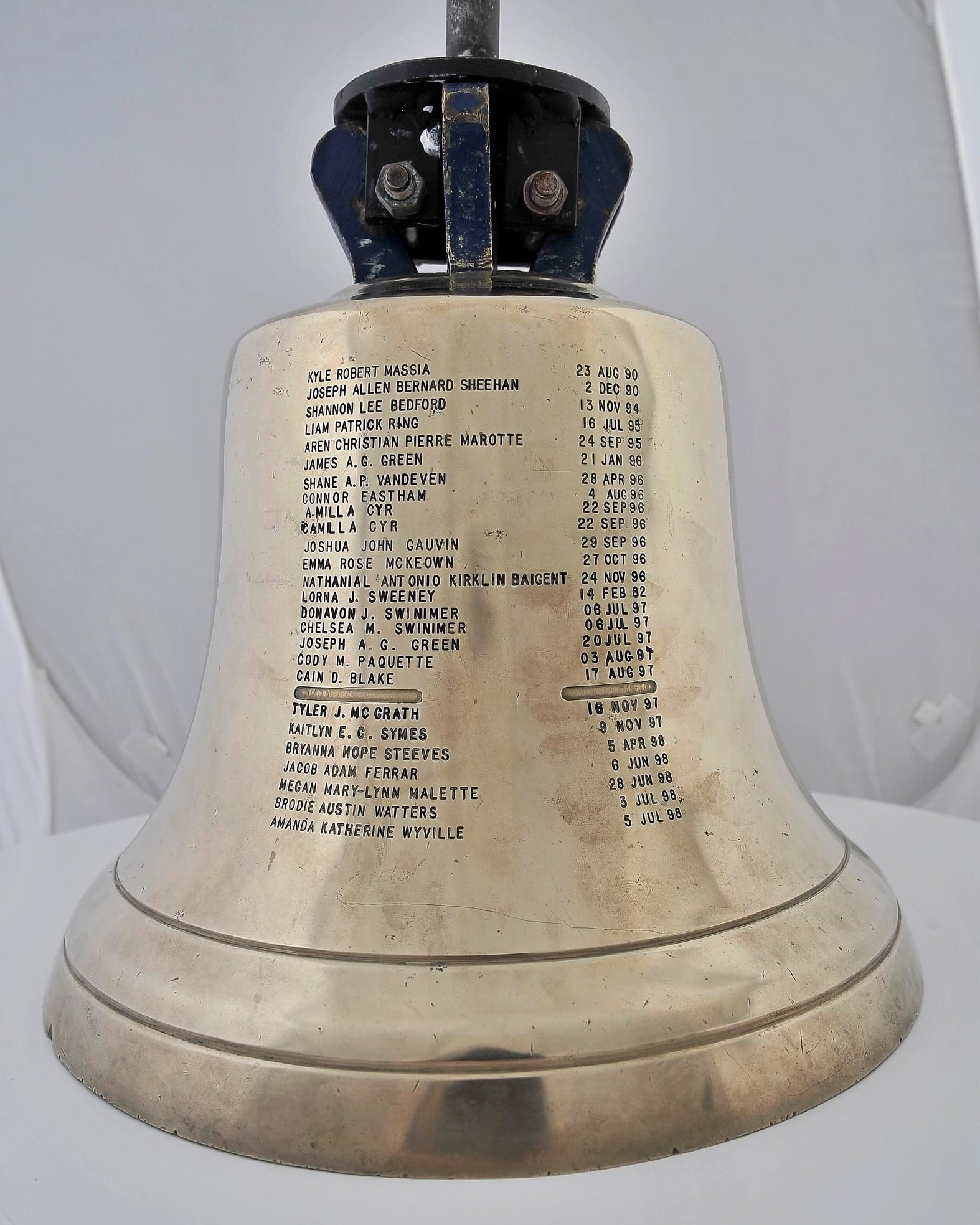 Names engraved on the bell of HMCS NIPIGON at RCSCC NIPIGON, Oromocto, NB