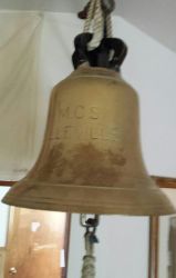 The ship's bell for HMCS BELLEVILLE K332 is on display at Navy League of Canada Belleville Branch building in Belleville Ontario under the stewardship of RCSCC QUINTE