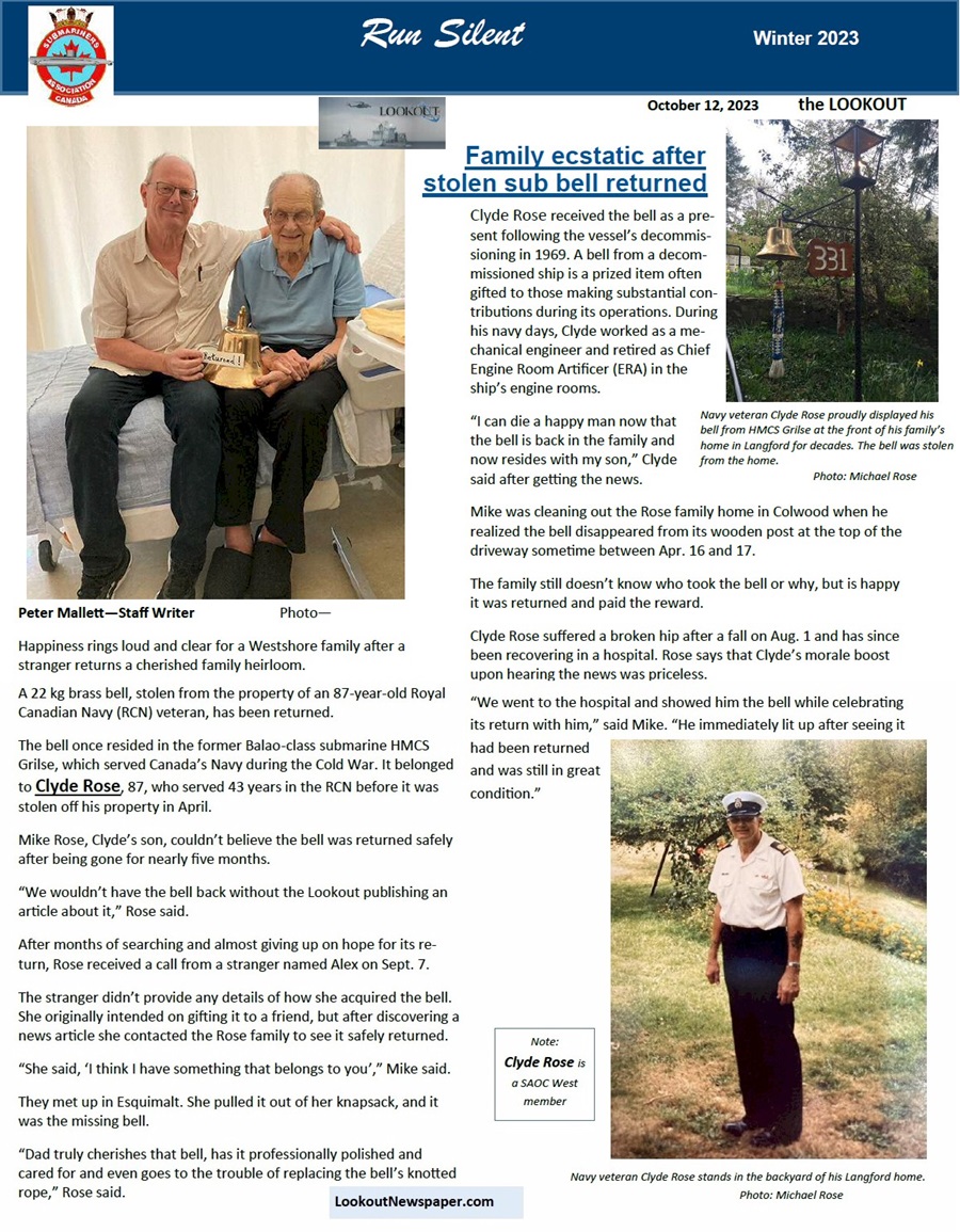 (Below) Article from the SAOC "Run Silent" Winter 2023 newsletter on CPO2 Clyde Rose and one of the bells of HMCS GRILSE