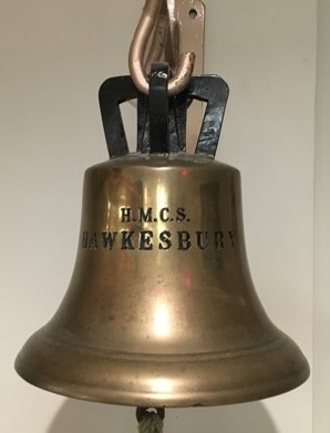 The bell for HMCS HAWKESBURY is located at the Royal Canadian Legion Branch 472, 152 Legion St. E., Hawkesbury, Ontario.