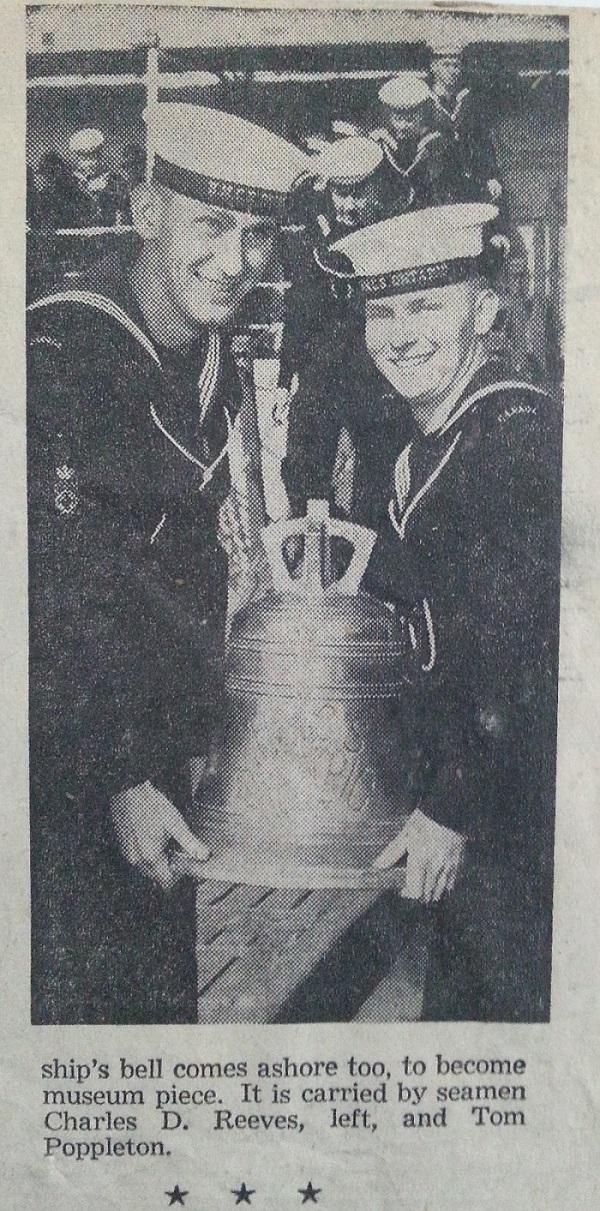 HMCS ONTARIO'S bell comes ashore carried by seamen Charles D. Reeves and Tom Poppleton