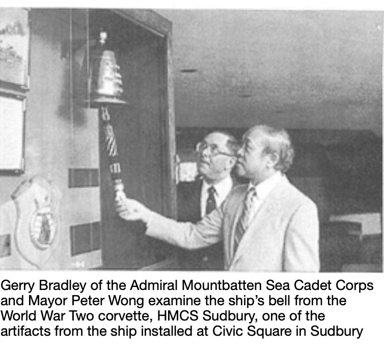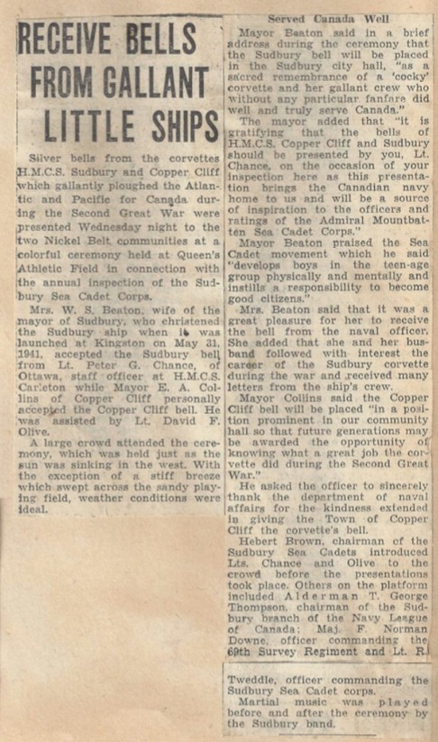HMCS Sudbury's Bell made it back to Sudbury, ON along with HMCS Copper Cliff's Ship's Bell in 1946. They were both presented by Lt Peter Chance RCN.
