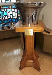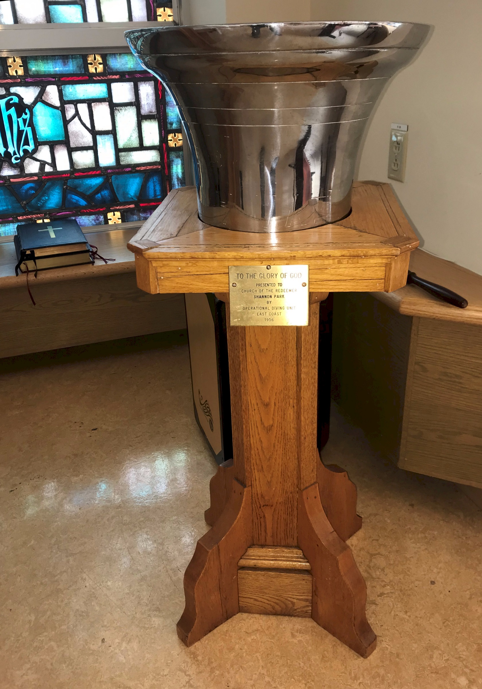 BELL BECOMES BAPTISMAL FONT The bell of the Spanish tanker which sank off Herring Cove during the Second World War has become a baptismal fount in the Church of the Redeemer at Shannon Park. At a brief ceremony on board HMCS GRANBY in Halifax, Lt-Cdr Charles S. Smedley, commanding officeer of the ship, which is Atlantic headquarters for the RCN's Operational Diving Unit, presented the font to Chaplain A.G. Faraday of the Church of the Redeemer. The bell came from the Spanish tanker Nueva Andalucia, which sank at Mars Rock, near Herring Cove in 1943 after having been in collision with the battleship HMS REVENGE. The bell was recovered by divers from the GRANBY on August 3, 1956, during diving operations at the site. Later, the bell was cleaned and plated by members of the ship's company and a stand to support the bell was build at the unit. The new font was dedicated at a Sunday service in the Shannon Park church