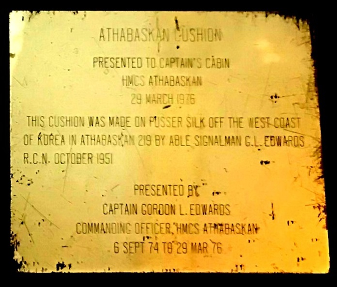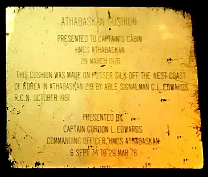 The ship's bell and captain's cushion for HMCS ATHABASKAN R79 / 219 is on display at the Naval Museum of Halifax, CFB Halifax, NS. The plaque on the right acknowledges the presentation of the cushion to the Captain's Cabin from Captain Gordon L. Edwards. The cushion was made by Able Seaman G.L. Edwards in Athabaskan 219, October 1951.