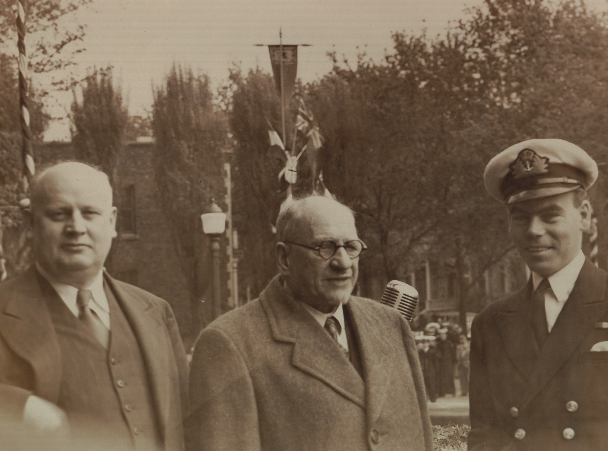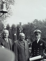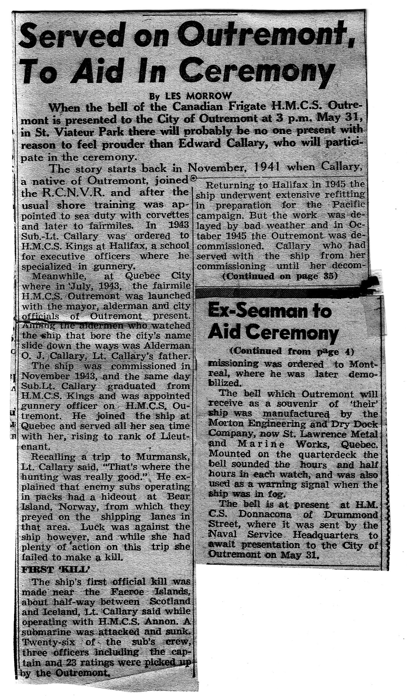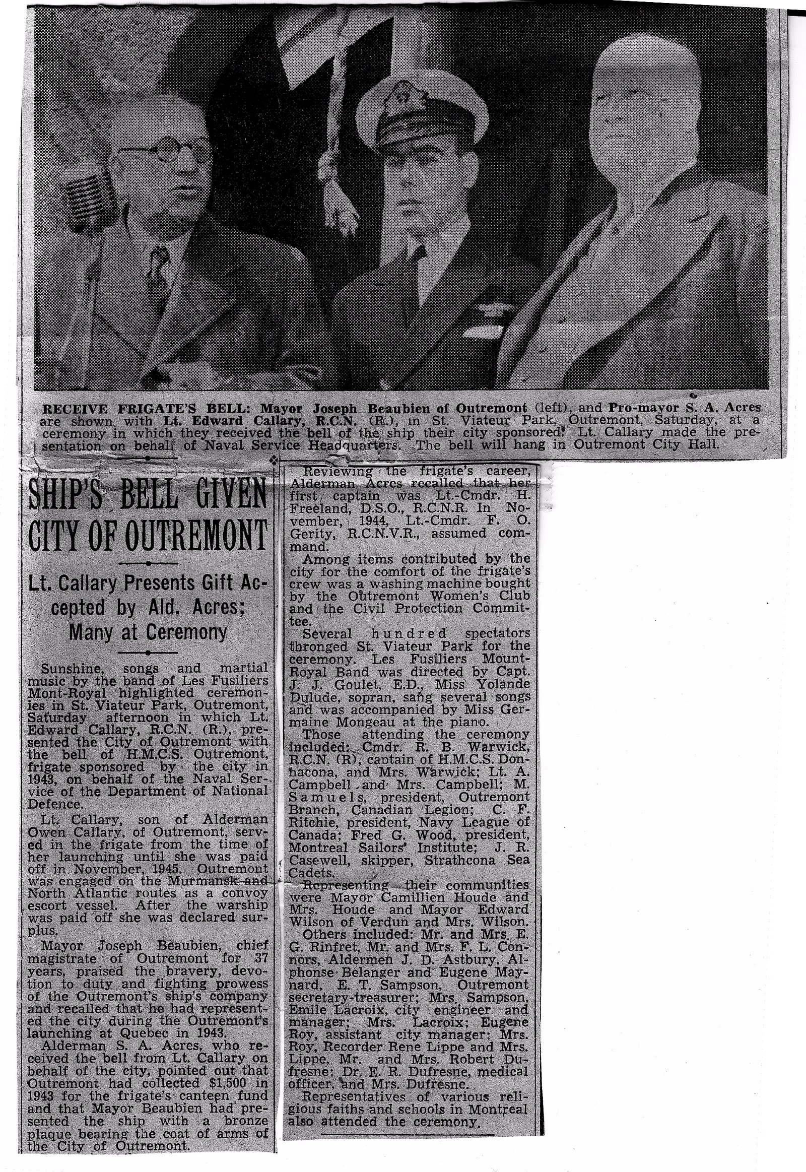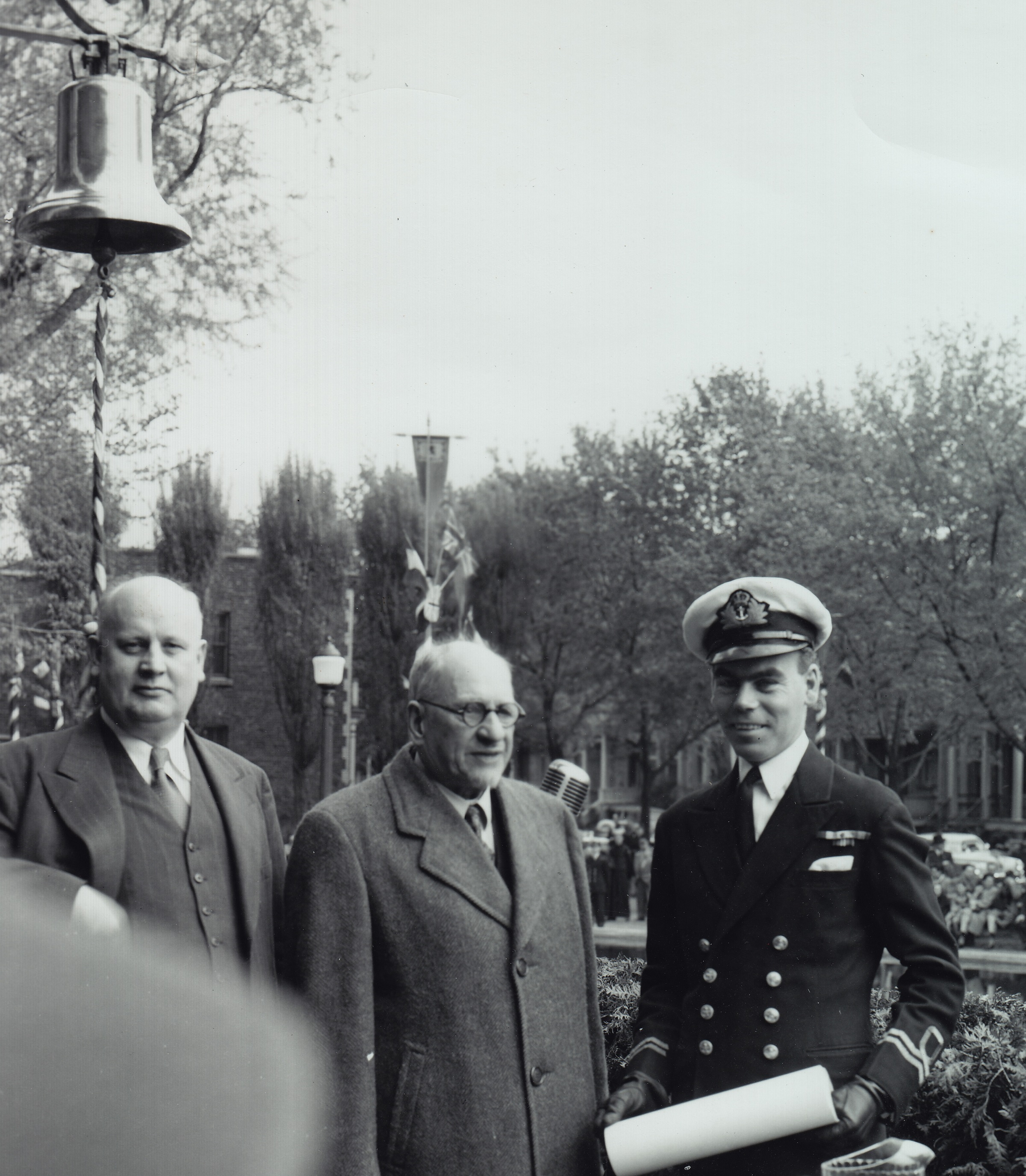 The presentation of the bell of HMCS OUTREMONT to the city of Outremont, Quebec by Lt Ed Callary, RCN(R) From the collection of Ed Callary, Lieutenant, RCN(R) Courtesy of Stephen Callary