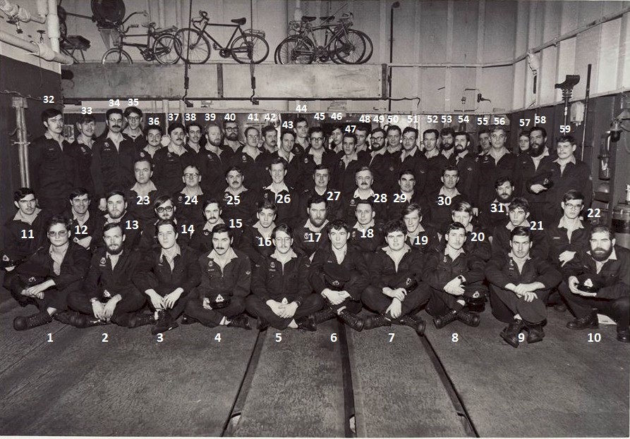 (1) Deck, Kenny (2) Dupont, David, AB (10) poss - Pease, Greg, P2ET (22) Polvi (??), Bob (26) Baby EO (27) EO (28) Branchaud, George, CPO1, CERA (29) Roy, John (Junior), C1ET (31) Burke, Roger, P2ET (35) Roy, Robert (Bob), AB (49) Beaulieu, Andy, P2ET (52) poss - Walsh, Mike, P1ET (56) Prescott, M., P1ER (59) Dunn, Bob, P1ER