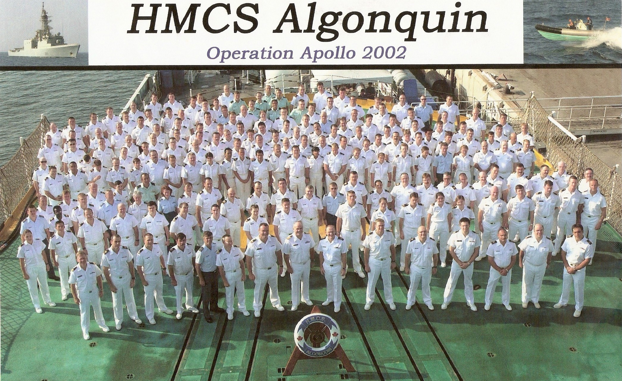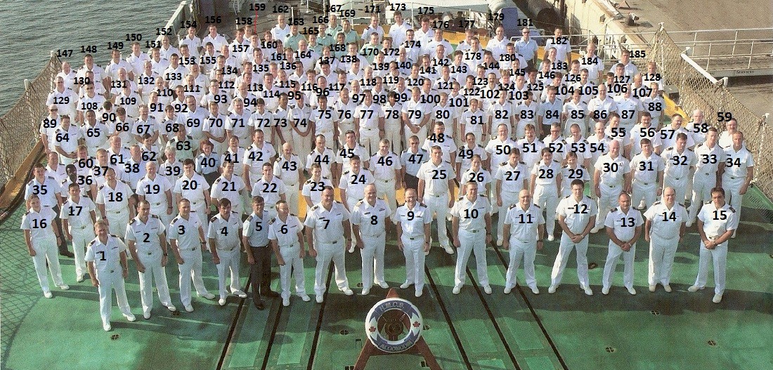 HMCS ALGONQUIN 283 OP APOLLO 2002 Courtesy of Steve Hutchings Click on the above photo to view a larger image (1) Mitchell, Don, Lt (N), Deck O (2) Newcombe, Bob, CPO2, Chief ET (3) Riis, Dan, Lt (N), E.O. (4) Kearney, Mike, CPO2, Chief H.T. (5) Ullock, Joe, MWO, Chief Storesman (7) Young, Doug, LCdr, XO (8) Paulson, Gary, Capt (N), C.O. (9) Hutchings, Steve, CPO1, Cox'n (10) Waddell, Steve, LCdr (11) Allard, Barry, CPO2, Cbt Chief (12) Barnard, Julien, LCdr (13) Schwenker, Brian, CPO2, CSE Chief (15) Nadasde, Don, CPO2, Chief BN (17) Chu, Peter, Lt (N) (20) Hamilton, Jeff, Lt (N) (24) Riche, K., Lt (N) (30) Erwin, Mike, LCdr (34) Tkachuk, Cam, SLT (37) Street, Brett, PO1 (39) Wesenberg, H., PO1 (40) Belle, WO (Air), Chief Cook (41) Dutka, Barry, PO1 (42) Beaulac, John, PO2 (46) Jakubowski, Curtis, Snr Nav Comm (48) Blore, Bill, PO2 (49) Chapleau, M.J., PO1, Snr Nac Op (50) Martin, Claude, PO1 (51) Phillips, Don, PO1 (56) Llewyllen, Jim, PO2 (58) Cahoon, Doug, PO2 (60) Fortin, PO1, Snr Stwd (62) Wilkinson, John, PO2 (63) Moffatt, WO (Land), Physician's Assistant (65) Catigay, Chris, MS (68) Bird, Ross, LS (74) Levesque, Helene, MS (78) Brink, Robin, MS (120) Mars, Michael (133) Kowalyk, Keith (136) Billis, Shawn (141) Sheffar, Jim (143) Fielding, Aaron (155) Maroeu, Stephan (166) Beaulieu, Cpl (Land), Storesman (167) Laughlin, Cpl (Land), Storesman (168) Alleyne, Nancy, Cpl (169) Thompson, Cpl (Land), Storesman (175) Cote, Ed, MS (177) Dube, LS, Storesman (179) Lamoureux, MS, Storesman, I/C Stores Office (181) Lawson, Cpl (Air), Storesman