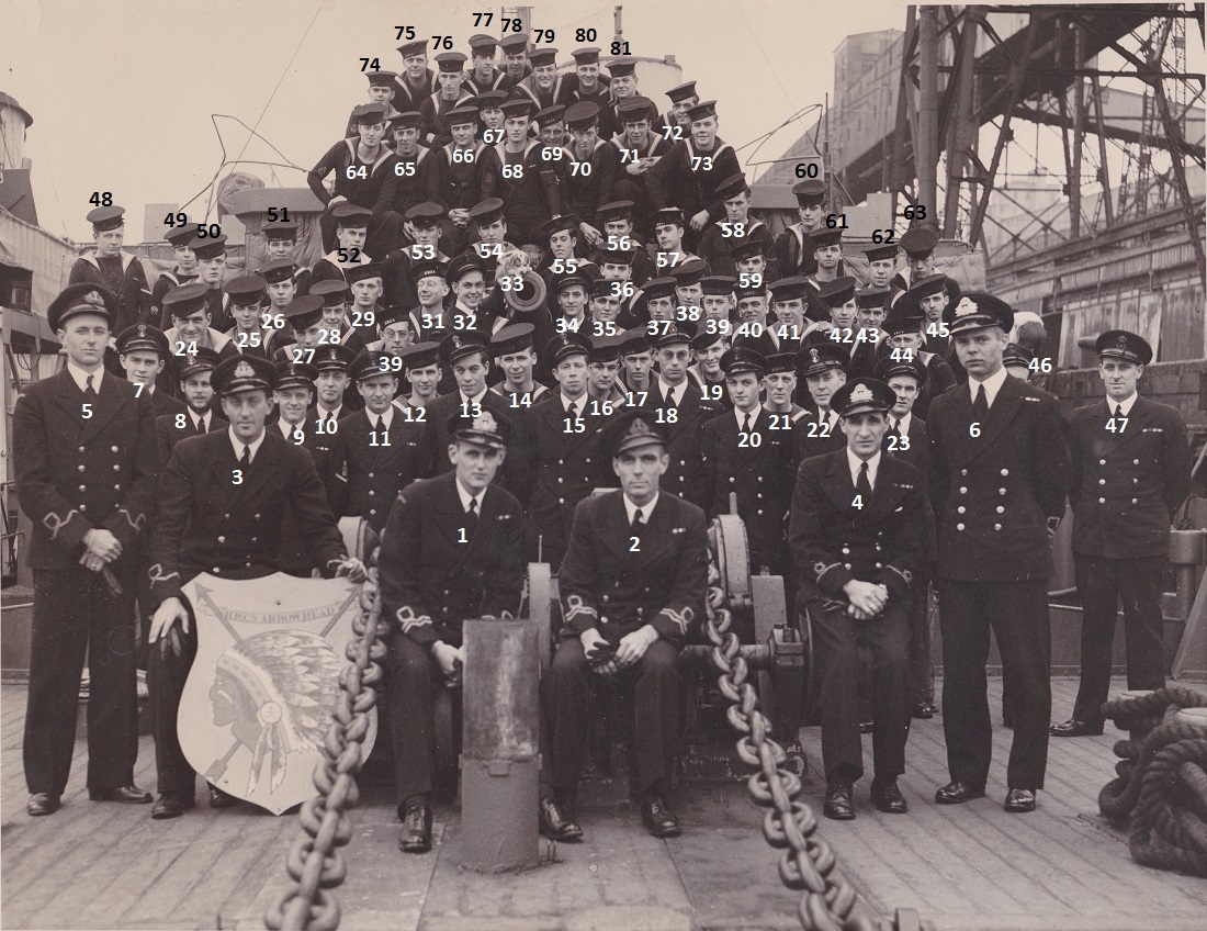 (1) Sylvester, Roy, Lt, RCNVR (2) Warwick, William (Bill), RCNVR (18) Buxton, Kenneth, CPO (33) Ship's Mascot (41) Martin, Earl A. (Bill) (42) Fedyk, John Joseph (74) Hollingshead, Robert (Bob) (81) Martynuik, William From the collection of John Wampler Courtesy of Barb Ishler