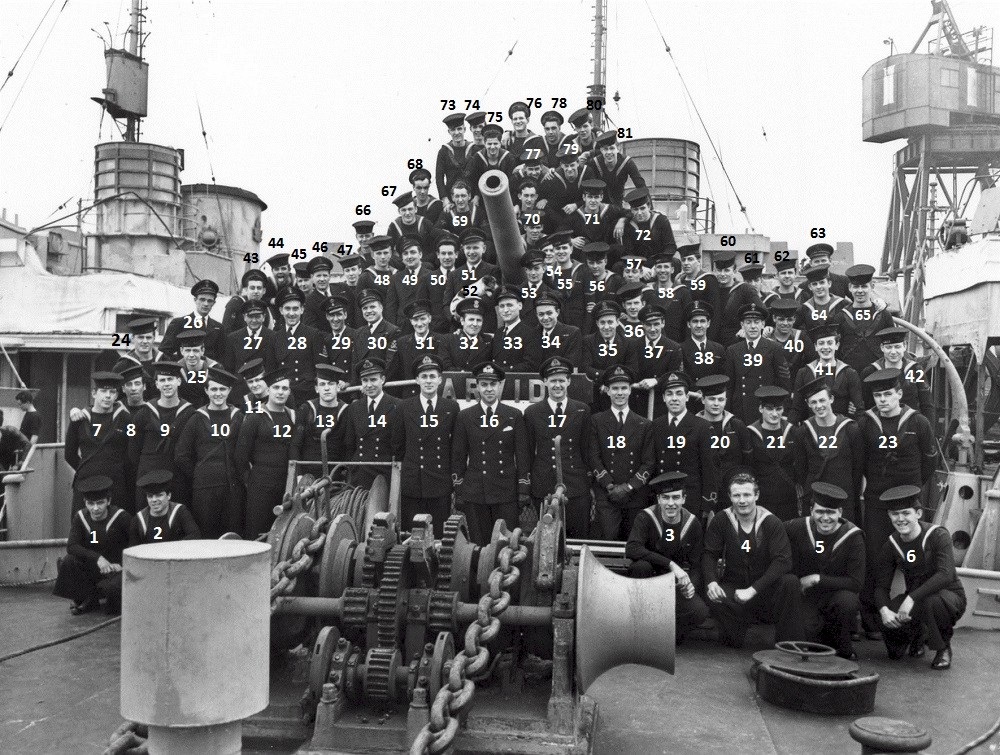 (10) Campbell, John Patrick (19) Reid, Donald W., SLt, RCNVR (21) Johns, William Francis, A/L/Sig (37) Donaldson, Gordon (46) Towle, John W. (Jack), Cook (53) Patterson, St Clair, Steward (56) possibly Stevens, Clifford Harvey (76) McLeod, Donald