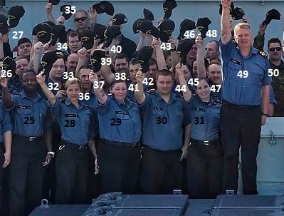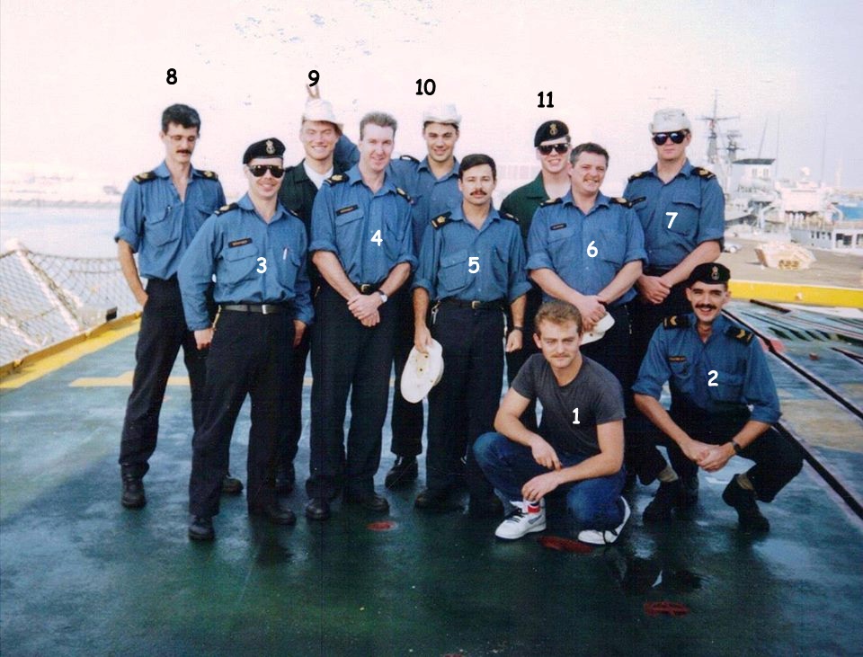 (1) Tufts, Ernie, OS (2) Tremblay, Stephane, LS (3) Dempsey, Mike, MS (4) Kennedy, Dan, PO2 (5) Pesant, Guy, PO1 (6) Samms, Emanuel, PO2 (7) Caldwell, Eldon, MS (8) Hobson, Steve, MS (9) Grondin, Roger, AB (10) Finch, Corey, OS (11) Wiper, Steve, LS