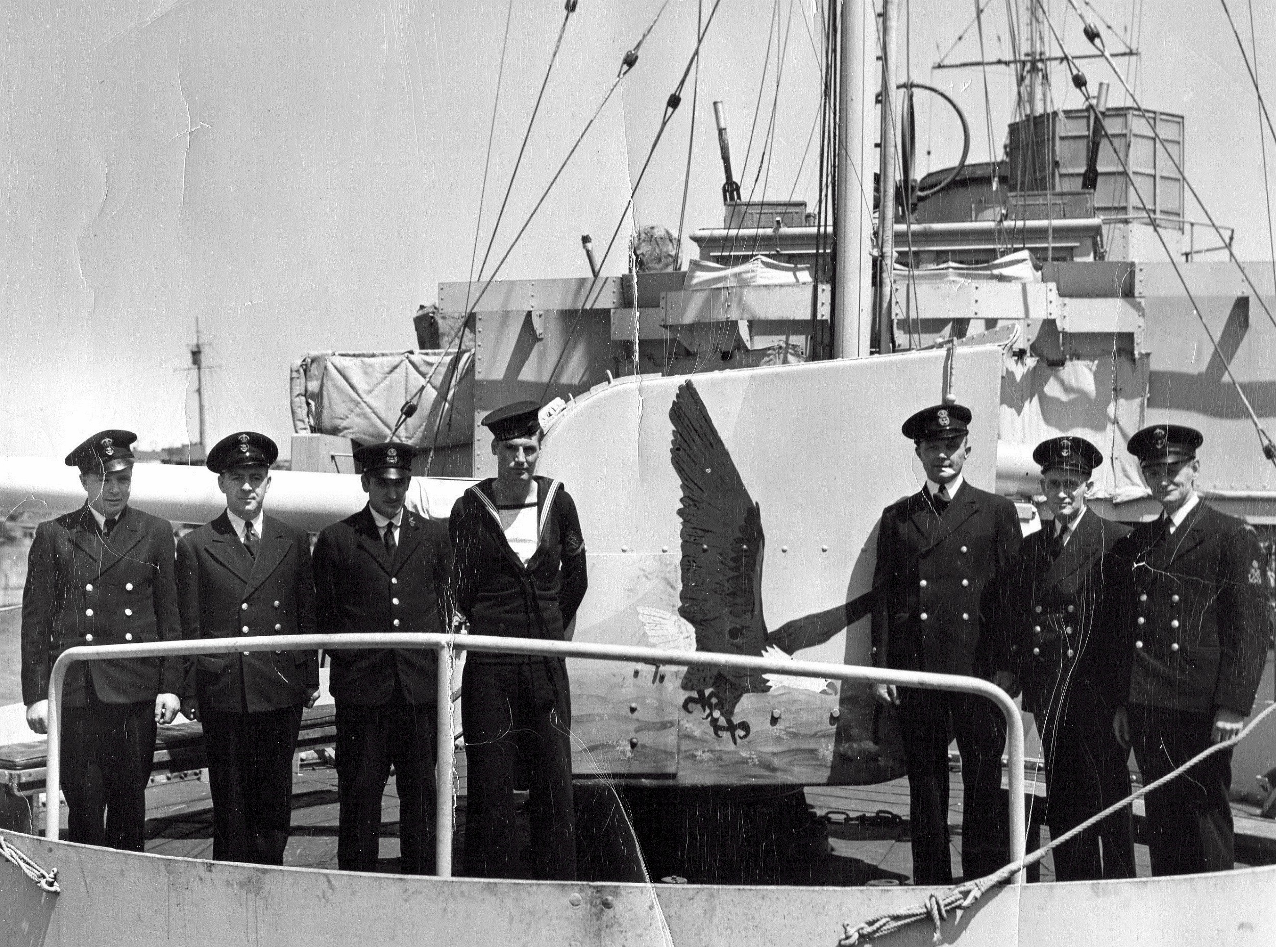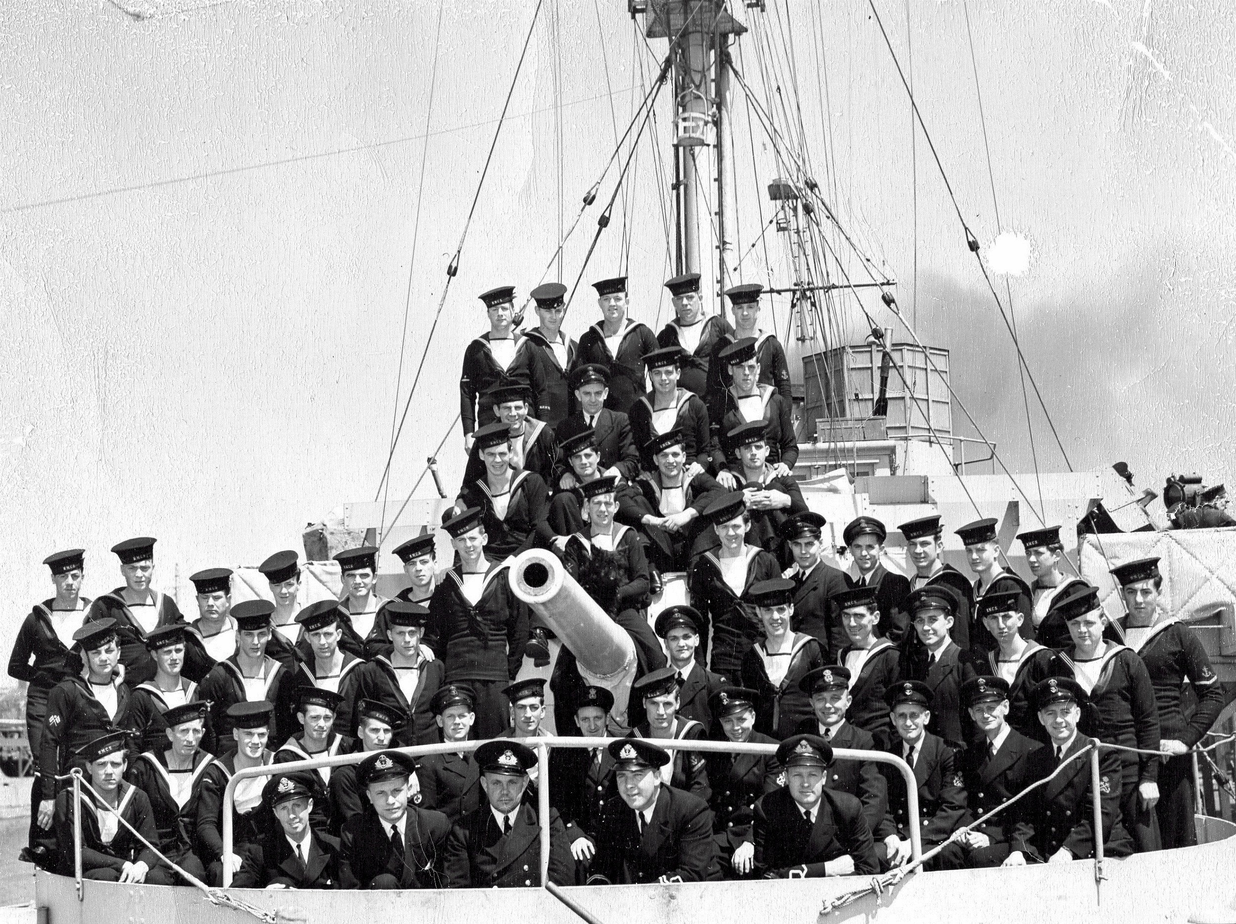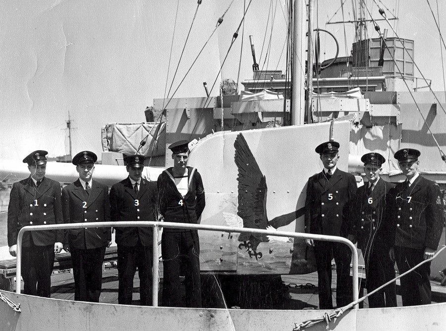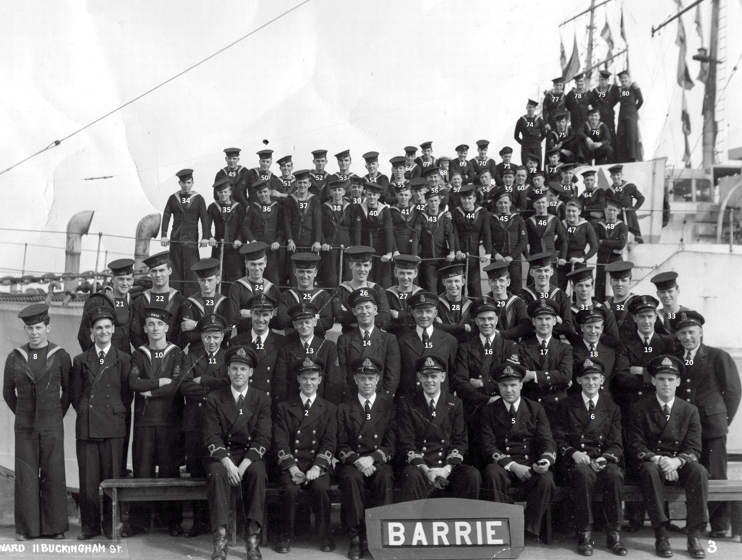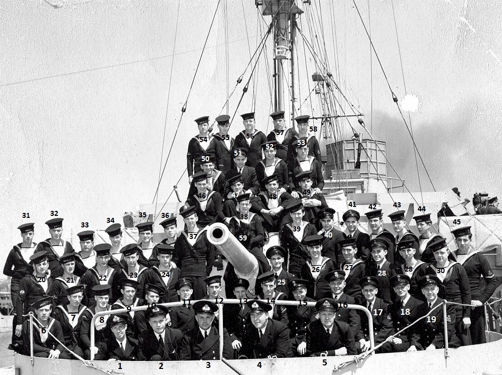 (3) Mosher, Roy, A/LCdr, RCNR, CO (16) Ross, Charles Albert, CPO (18) Wilson, James Arthur (Art) (32) Moore, Douglas (37) Weimer, Albert David (59) Ship's mascot sitting on gun barrel in front of #38
