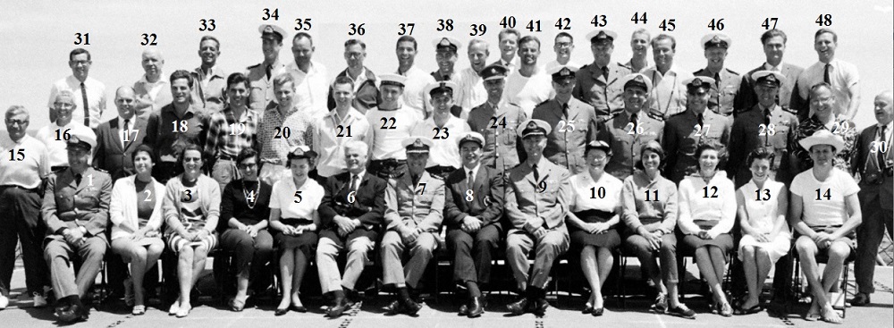(01) LCdr Channing (Chan) Deacon Gillis, RCN, Executive Officer (02) Mme. Cleopatre Montandon, Sociology (03) Dr. Helen Reid, Medical Examination and Pediatrics (04) Mrs. Ana Maria Eccles, Research Assistance and Interpretation (05) Lt Rita Katherine Dwyer, RCN, Research Assistance and Interpretation (06) AVM John A. Easton, RCAF (Ret'd), Deputy Director-Physical Plant (07) Cdr Charles Anthony (Tony) Law, DSC, RCN, Commanding Officer (08) Dr. Stanley C. Skoryna, METEI Director and Gastrointestinal Diseases (09) Surg. Capt. Richard Howell Roberts, RCN, Deputy Director -Medical Examination and Genetics (10) Lt Mary Olive King, RCN, Research Assistance (11) Mrs. Isabel Griffiths, Research Assistance and Interpretation (12) Dr. Sheila Maureen Howell Roberts, Medical Examination and Genetics (13) Miss Carlotta Leila Hacker, Research Assistance (UK) (14) Dr. Gonzalo Donoso, Nutrition (Chile) (15) Mr. Carl Mydans, Life Magazine, Photography (USA) (16) CPO Frederick (Fred) Joyce, RCN, Laboratory Technologist (17) Mr.. Robert (Bob) Williams, Director, CBC, Radio Journalism (18) Dr. Denys Marc Montadon. Medical Examination and Laboratory (19) Mr. George Hrischenko, CBC, Radio Communications (20) Dr. Ian Ecott Efford, Biology/Ecology (21) Mr. Thomas Colin Gillingham, Catering (UK) (22) AB Robert Allan Fulton, RCN, Mechanical/Electrical (23) CPO George Henry (Harry) Crossman, RCN, Mechanical/Electrical (24) Maj Alexander (Al)G. Taylor, RCDC, Odontology (25) Lt (*) Robert Banting Carson Manzer, RCN, Deck Officer (26) LCdr(E) Duff M. Pennie, RCN, Engineering Officer/Support Group Coordinator (27) LCdr(S) Alfred E. Shaw, RCN, Supply Officer/ Logistics Coordinator (28) LCdr(C) Robert Arthur Billard, RCN, Installation Superintendent (29) Dr. Garry S. Brody, Medical Examinations (USA) (30) David Bell Macfarlane, Montreal Star, Journalist (31) Mr. Robert (Bob) John Meir, Anthropology (USA) (32) George Archibald (Archie) Wilkinson, Radiography (33) Dr. John L. Cutler, Epidemiology (USA) (34) Lt Charles L. Westropp, RCN, Navigation Officer (35) Dr. Harold Cuthbert Gibbs, Human, Animal Parasitology (36) Dr. Armand Boudreault, Virology (37) Dr. Morton Elliot Alpert, Epidemiology (USA) (38) Surg.Lt Gilbert Joseph Berube, RCN, Medical Officer (39) Mr. James (Jim)McHenry Nielsen, Physiology (USA) (40) Mr. Hector (Red) J. Lemieux, NFB, Filmmaker (41) Dr. Peter Beighten, Medical Examination and Tropical Diseases (UK) (42) Mr. John (Jack) Anthony Mathias, Biology/Ecology