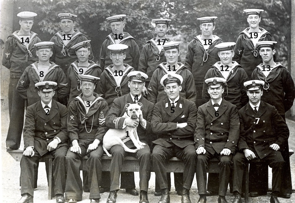 (1) Ship's mascot (2) Pearson, Richard, ERA (3) Purvis, G. PO, Coxn (4) Johnston, Barney L., LT, CO (5) Edwards, "Boy", Midshipman (6) Hunting, Jim, CERA (7) Conroy, Pete, ERA3 (8) Lee, "Ginger", Stoker (9) Herrod, ?, AB (10) Flannigan, Tom, Stoker (11) Unknown (12) Unknown (13) Sutherland, Jack, Stoker (14) Warner, Dick, Leading Stoker (15) Roberts, ?, PO Stoker (16) Moulder, John, LTO (17) Lock, "Shorty", AB (18) Simmonds, "Simmo", Stoker (19) Finmore, ?, Stoker. Names Courtesy of Brian Lapierre