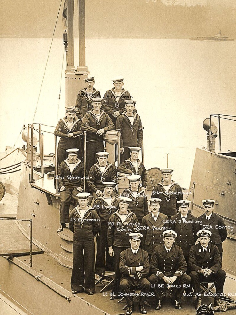 Front: Johnson, B.L., Lt, RCNR; Jones, B.E., Lt, RN; Edwards, D.G., Midshipman, RCN 2nd Row: Foreman, LS; Purvis, G., PO, Cox'n; Pearson, ERA; Hunting, J., CERA; Conroy, ERA 3rd Row: Locke, AB; Molder, LTO; Sutherland, Sto 4th Row: Simmonsy, Sto; unknown, unknown 5th Row: unknown, unknown, unknown Top Row: Herod, AB; Foreman, LS