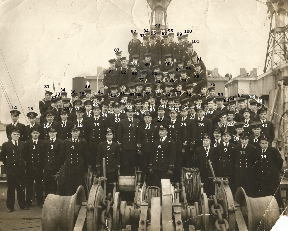 (6) Ross, Charles A., Acting Warrant Engineer, RCNR (12) Larocque, Paul Joseph (17) Payne, Robert, Chief Petty Officer (24) Goode, Cephas (Bud), Lieutenant (35) Macneill, Gerald Henry (63) Reid, Harold (66) Wray, John, Submarine Detector, RCNVR (67) Ham, Wesley Douglas (68) Jacobs, Robert Joseph (69) Carey, William J. (Bill) (70) Ship's Mascot (72) Hughes, John W. (82) Bell, Ronald Wellington (99) Day, Donald (100) Morton, Owen William, Stoker, RCNVR