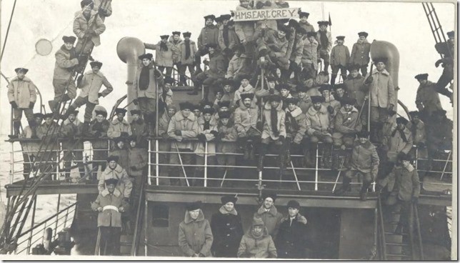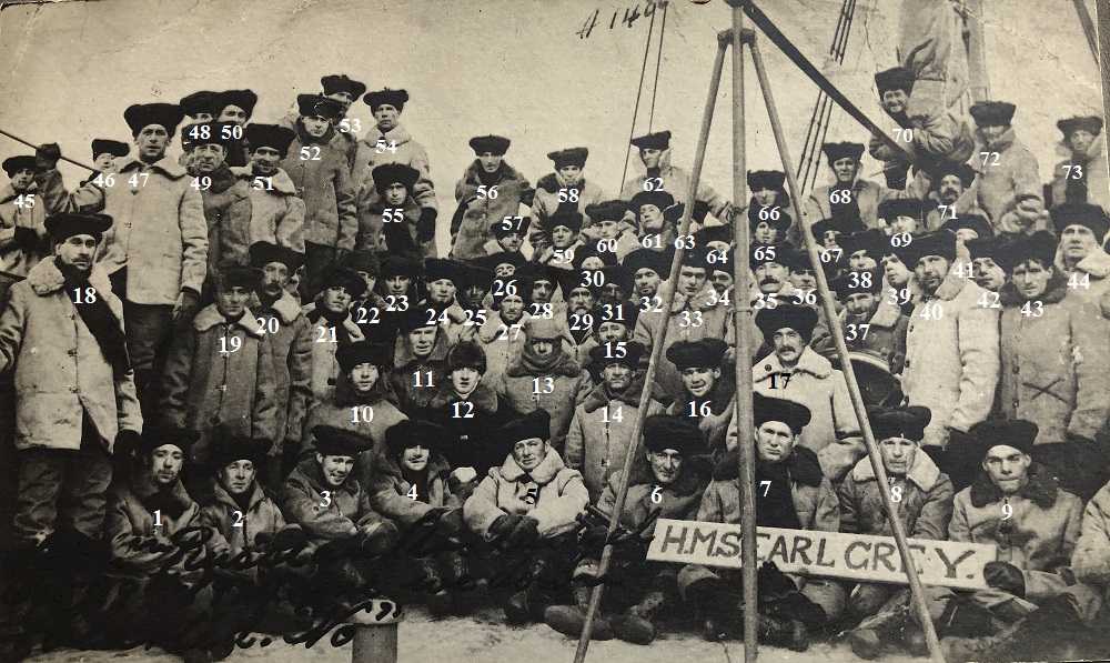 Crew of HMCS EARL GREY (contrary to the sign stating HMS EARL GREY) Source: LAC Govt of Canada General files re HMCS EARL GREY 1914-15. RG24 Vol 3970 page 6. file NSC 1047-22-2