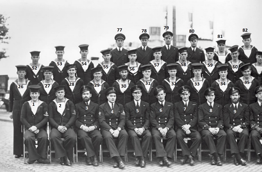 (00) Ship's Mascot "Hero" (13) Johnson, Kenneth Lorne, LCdr, RCNVR, CO (36) Casey, Patrick, Coder (37) Coulter, Calvin Charles (39) Hooper, Albert (of Ottawa, ON) (64) Puddicombe, William Charles