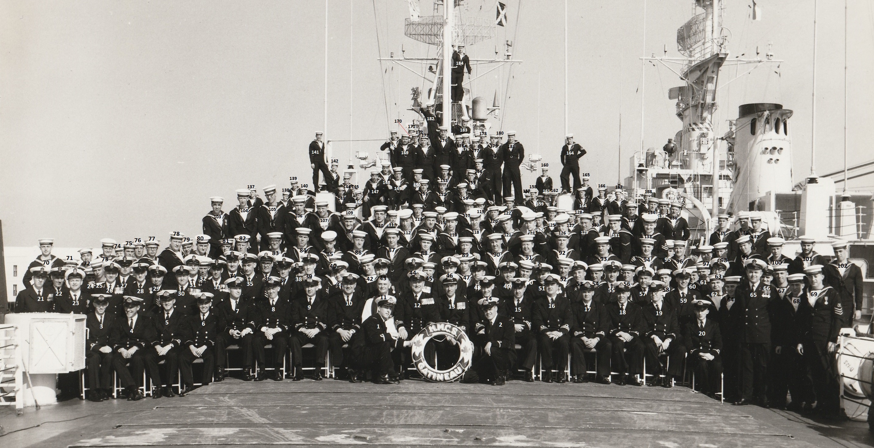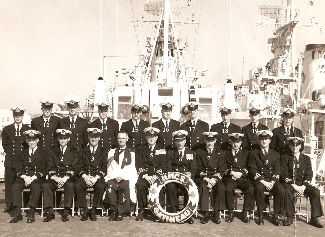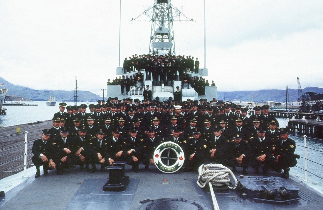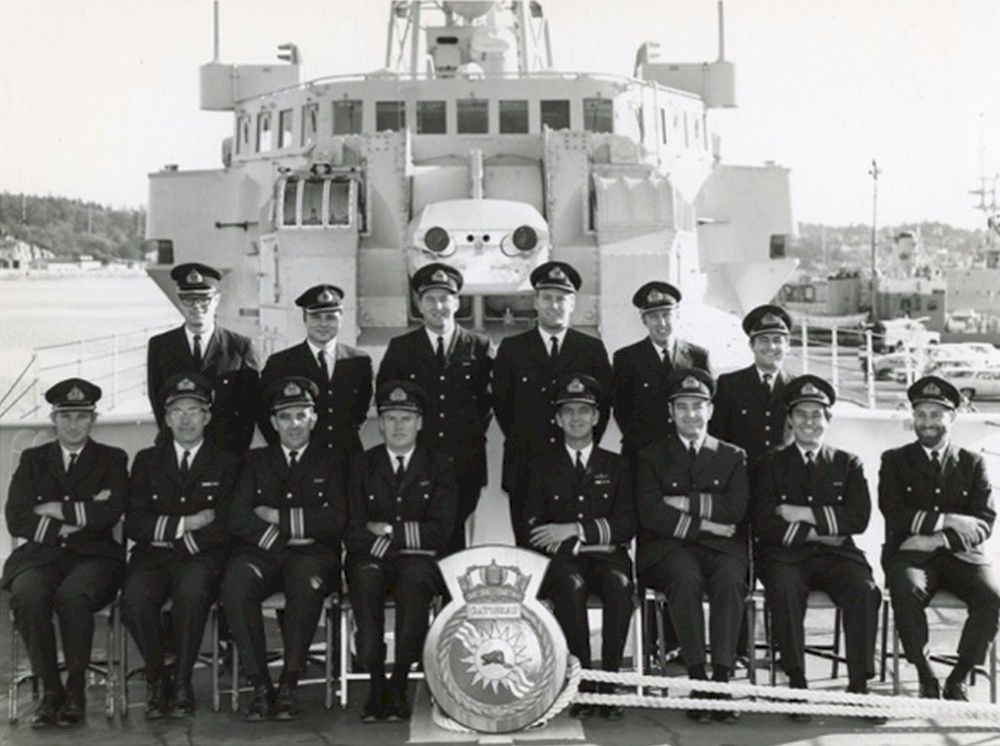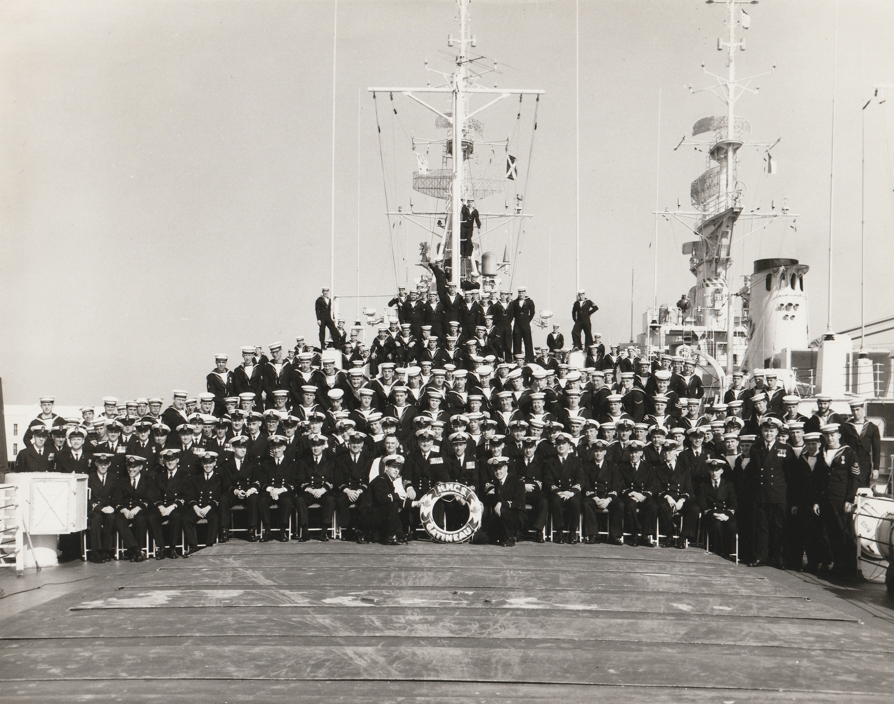 (4) Duncan, Donald, C1ERA (5) Heath, Thomas Charles (Ted), Cdr, CO (7) Booth, Brian, C1BN, Cox'n (12) Taylor, W. Bill, P2FC (15) Pare, O. M., P2ET (17) Boulter, Ed, P2ER (25) Clarke, Robert, PO2 (Weapons) (28) Thom, M. J., P2HT (30) LeMercier, Tyrone, P1RM (31) Carter, M. A., P2WU (33) Hlasny, Steve, C2LT (34) Bruvels, N. K., C2ER (36) Cowling, D., P2SN (52) Morrow, R., P2SG (56) Hamm, C2ER (98) Cram, LS.HT
