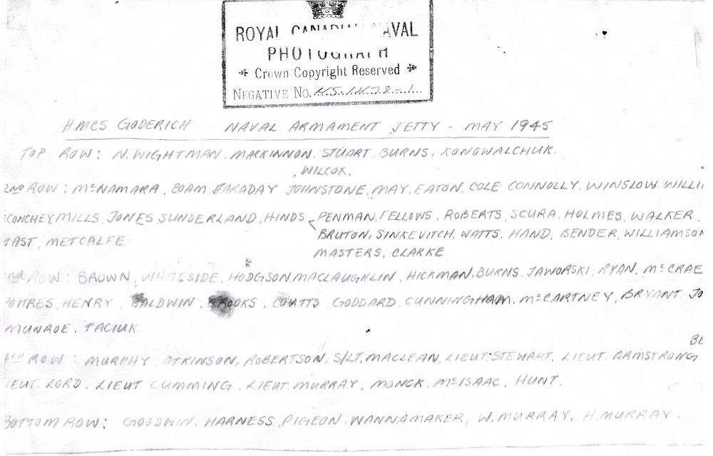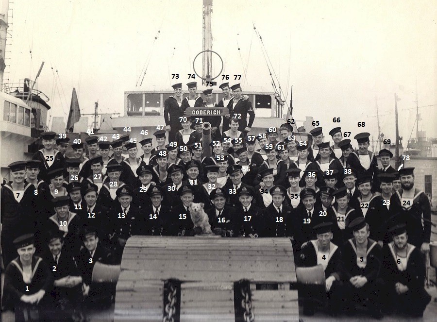 (1) Goodwon (2) Harness (3) Pigeon, Paul J. (4) Wannamaker (5) Murray, W. (6) Murray, Harold L. (7) Brown (8) Whiteside (9) Hodgson (10) Murphy (11) Atkinson (12) Robertson (13) MacLean, SLt (14) Stewart, John Robert, SLt, RCNVR (15) Armstrong, Lt (16) Lord, Lt (17) Cumming, Lt (18) Murray, Lt (19) Monck (20) McIsaac (21) Hunt (22) McCartney (23) Bryant (24) Taciuk (26) MacLaughlin (27) Mickman (28) Burns (29) Jaworski (30) Ryan (31) McCrae (32) Poitres (33) Henry (34) Baldwin (35) Crooks (36) Coutts (37) Goddard (38) Cunningham (39) Boam (65) Roast, William S. (73) N. Wightman (74) MacKinnon (75) Stuart (76) Burns (77) Konowalchuk (78) Munroe