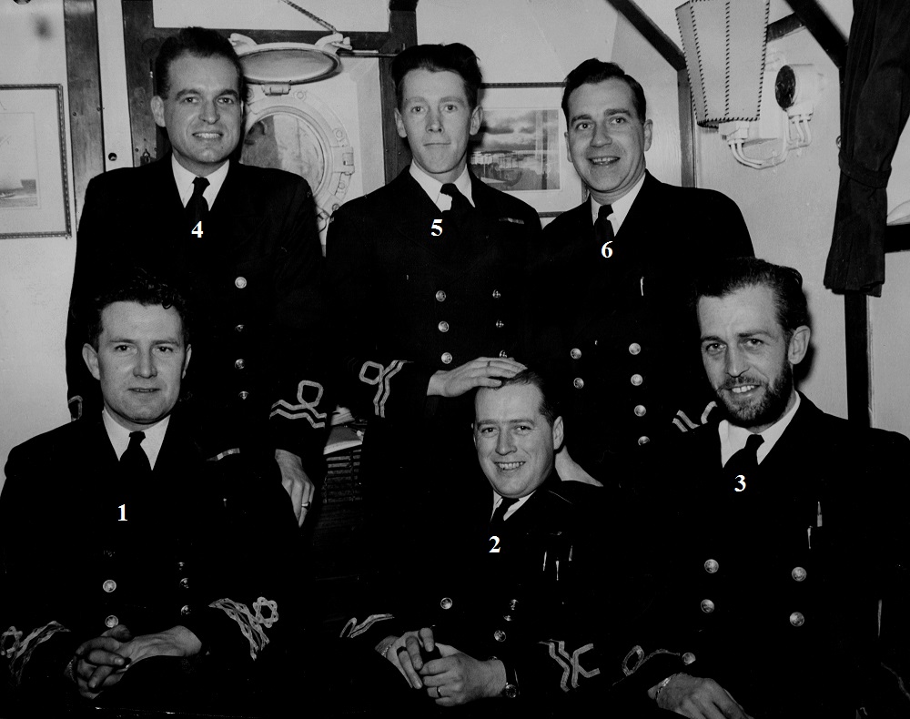 (1) Unknown (2) Armstrong, Edward, Lt, RCNVR (3) Stewart John Robert (Jack), SLt, RCNVR (4) Lord, Wallace (Wally), Lt, RCNVR (5) Murray, Clarence Rae, Lt, RCNVR (6) unknown