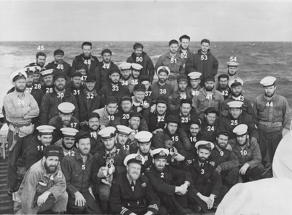 Members of HAIDA'S crew showing off their beards after a beard growing contest - 1953 Click on the above photo to view a larger image (6) Ship's mascot (7) Weir, Morley Logan (14) Ship's mascot - Pom Pom From the collection of Selwyn Dumaresq, LS.CR1, RCN Courtesy of Charles Dumaresq