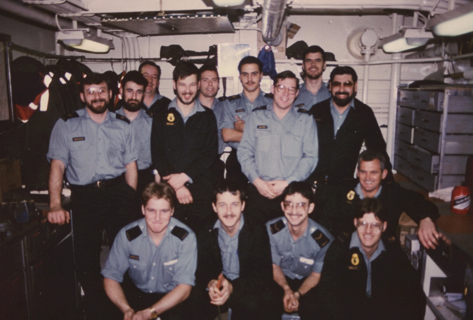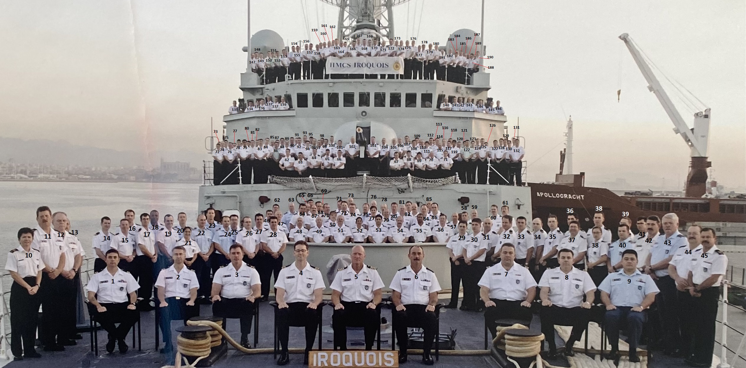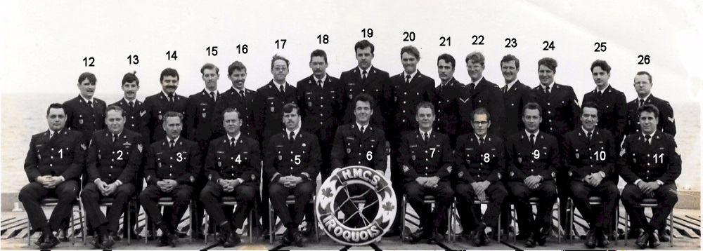 (10) Kelly, E., Cdr, C.O. (12) Cherry, Wayne, CPO1, Cox'n (15) Mah, W., PO2 (30) Leblanc, R., PO1 (33) Meadows, Paul, P2SG (45) Miller, Norm, P1RM (47) Firth, R., PO1 (61) Davidson, Keith, AB (97) Walker, Bill (102) Stone, J, PO1 (106) Beardstall, Peter, LS (110) Holland, Vaughn, AB.RP (114) Lapierre, B., PO1 (117) Sullivan, Brad, LS (118) Hawes, C., PO1 (122) Dow, R., LS (124) Marsden, E., PO2 (141) Prosser, D., PO1 (145) Birtwhistle, David, AB.ER (146) Balough, Charlie (149) Babin, James, AB.ER (150) Foster, A., PO1 (152) Kelly, W., CPO2 (153) Joyce, D., PO1 (155) Benjamin, AB (157) Eng, D., PO1 (158) Stevens, P., P1ER (160) Austin, Richard (164) Jewell, G., CPO2 (168) Jippes, A., CPO2 (169) Kverme, E., CPO2 (170) Field, M., CPO2 (173) Hillier, L., LS (176) Blackburn (177) Lajoie, Al (179) Owen, Terry (180) Price, T., LS (182) Brake, Charlie, P1SW (186) Carrigan, H., PO1