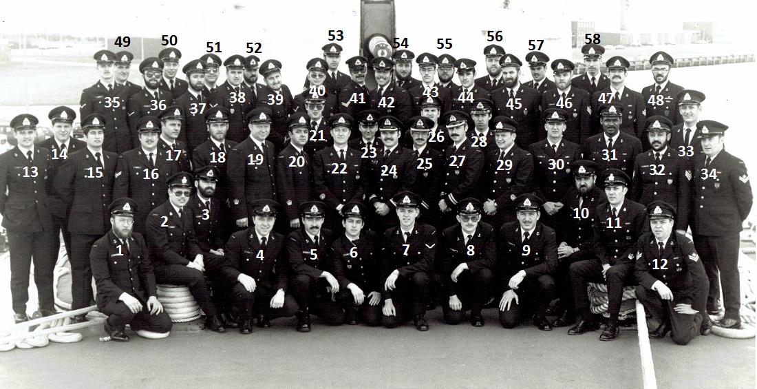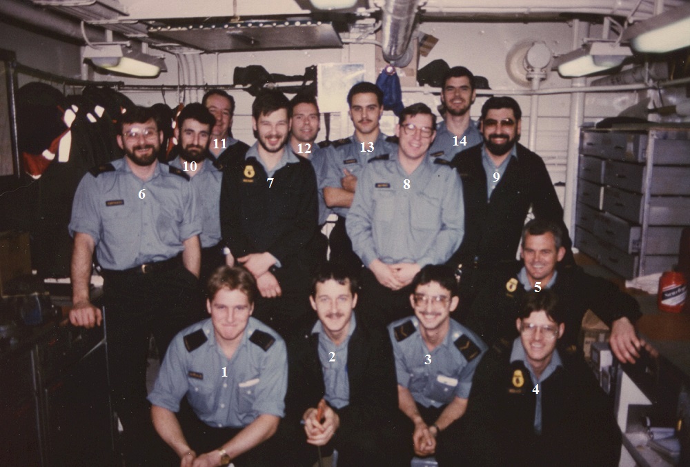 (36) Owens, Terry, ABRP (37) Hustoff, Andy, LS (39) MacDonald, (Black Mac), ABRP (42) Holland Vaughn, OSRP (43) Hart, David, OSEW (44) Spanick, Tom, OSRP (47) Kaiser, William (Bill), MS.SG (50) Chetwyn, Tim, ABRP (51) Muise, Tim, ABRP (53) Stabback, Garry, P2RP (54) Sheppard, Ivan, ABRP (57) Baird, Austin, ABEW (58) Groothuisen, Tony, OSEW