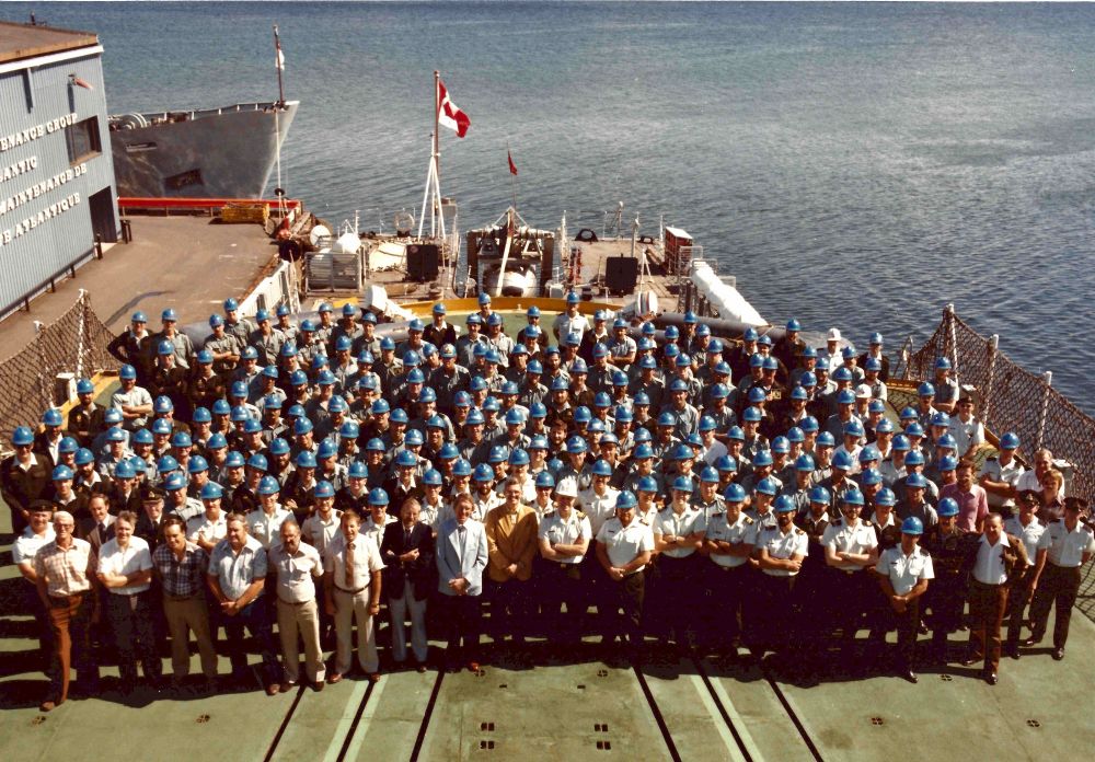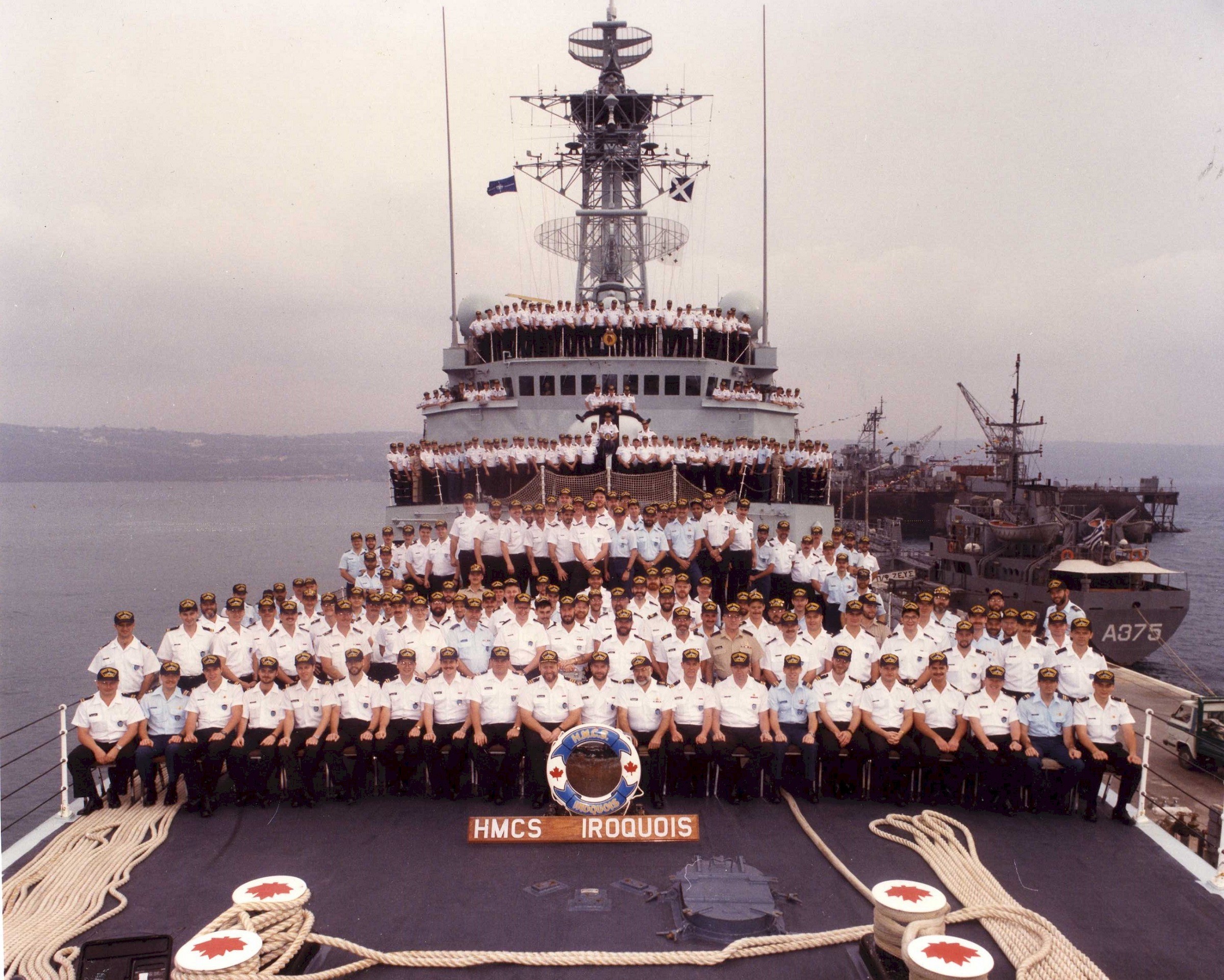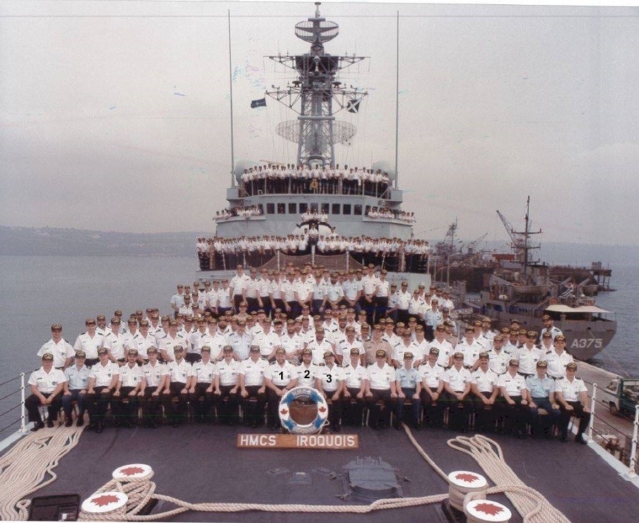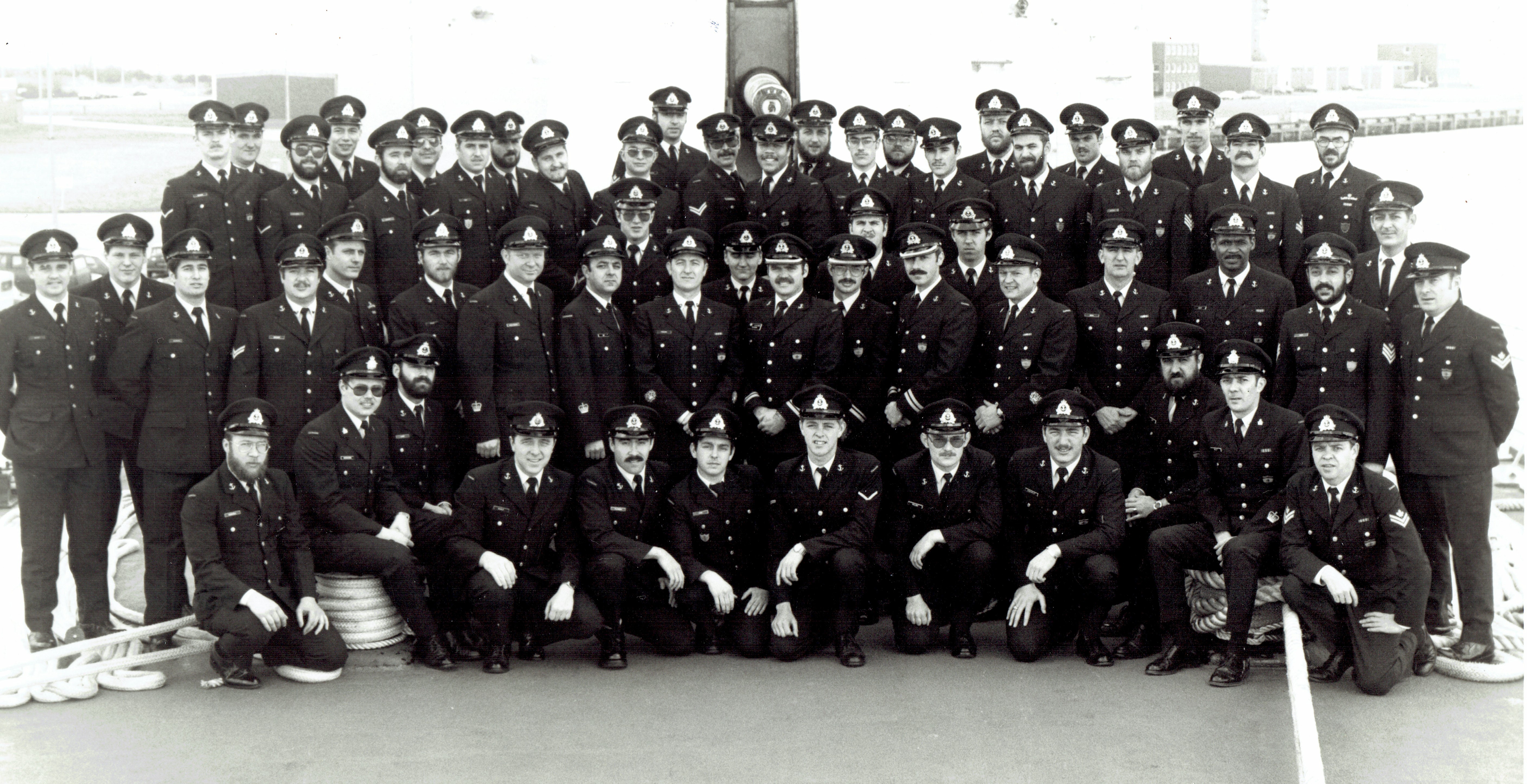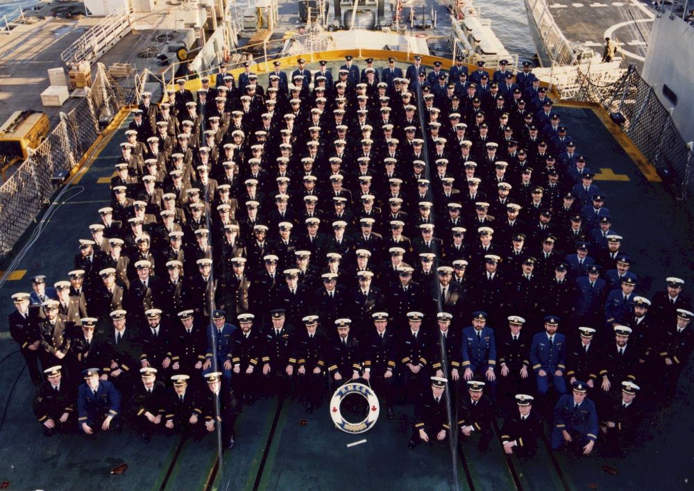 (10) Kelly, E., Cdr, C.O.  (12) Cherry, Wayne, CPO1, Cox'n  (15) Mah, W., PO2  (30) Leblanc, R., PO1  (33) Meadows, Paul, P2SG  (45) Miller, Norm, P1RM  (47) Firth, R., PO1  (61) Davidson, Keith, AB  (97) Walker, Bill  (102) Stone, J, PO1  (106) Beardstall, Peter, LS  (110) Holland, Vaughn, AB.RP  (114) Lapierre, B., PO1  (117) Sullivan, Brad, LS  (118) Hawes, C., PO1  (122) Dow, R., LS  (124) Marsden, E., PO2  (141) Prosser, D., PO1  (145) Birtwhistle, David, AB.ER  (146) Balough, Charlie  (149) Babin, James, AB.ER  (150) Foster, A., PO1  (152) Kelly, W., CPO2  (153) Joyce, D., PO1  (155) Benjamin, AB  (157) Eng, D., PO1  (158) Stevens, P., P1ER  (160) Austin, Richard  (164) Jewell, G., CPO2  (168) Jippes, A., CPO2  (169) Kverme, E., CPO2  (170) Field, M., CPO2  (173) Hillier, L., LS  (176) Blackburn  (177) Lajoie, Al  (179) Owen, Terry  (180)  Price, T., LS  (182) Brake, Charlie, P1SW  (186) Carrigan, H., PO1