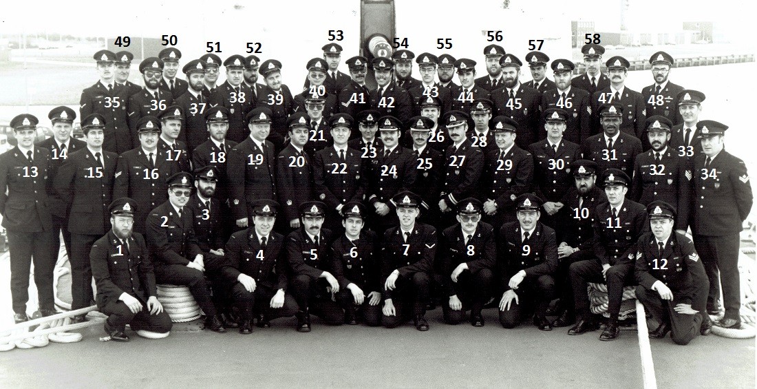 (16) Boisvert, Freddie, LS  (18) Childs, Fred, PO1  (19) McCutheon, H., PO1  (20) Eby, Ed , PO1  (21) Dionne, Yvon, LSEW  (22) Furlong, Jim, CPO2  (24) Dawe, Dick, SLt  (25) Therrian, SLt  (29) Cyprick, Art, C2EW  (31) Lucas, Gary, PO.RP  (32) Hood, Carl, P2EW  (33) Meadows, Paul, PO2  (34) Currie, Bob, MSSG