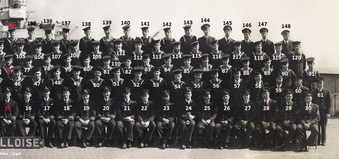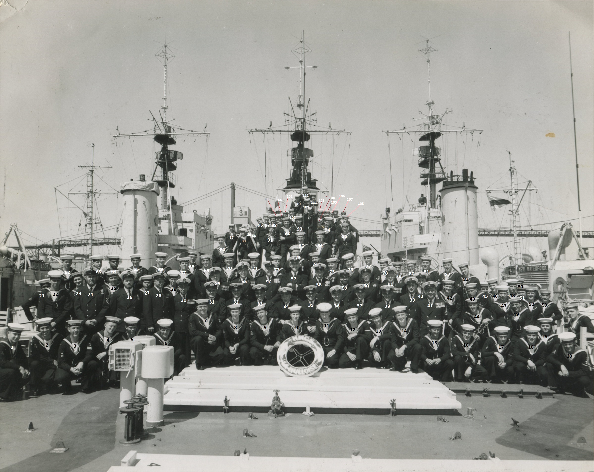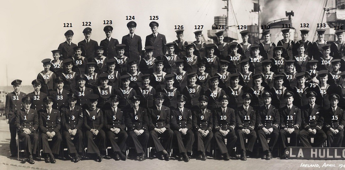 (1) Howard, Albert Murray, CPO  (4) Dawson, Lloyd Alexander, PO  (11) Welsman, George Grasett, Lt, RCNVR (15) Brock, John, LCdr, RCNVR, CO  (37) Craddock, George Hubert William (Bill)  (38) Artiss, Francis (Frank)  (62) Gable, Robert Philip Gordon  (63) Learn, George Francis  (75) Ship's Mascot  (97) Simpson, Hugh Arthur, Sig  (123) Fisher, William Buchanan