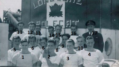 Canadian landing craft at D-Day were operated by relatively small crews of around 20 sailors. In this photograph, many of the crew of LCI(L)- 135 pose aboard their landing craft. The sailors are wearing white gunshirts, while a petty officer (back row, right) wears a cap and jacket. One of the sailors (front row, second from left) holds a rabbit mascot on his shoulder. The crew of 135 have christened their craft "Lonesome Polecat", painting the name on the ship's bridge, along with a maple leaf (background). Many other Canadian landing craft received similar nicknames and artwork.