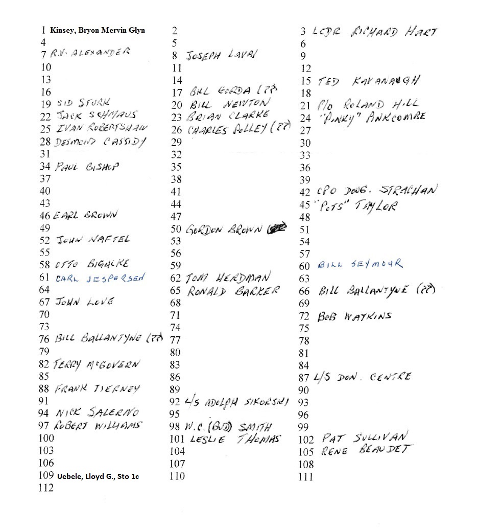 Below is a legend and list of names of the Commissioning Crew remembered by Bob Watkins. Once a better copy of the crew photo is found, it will be numbered in accordance with the legend below.