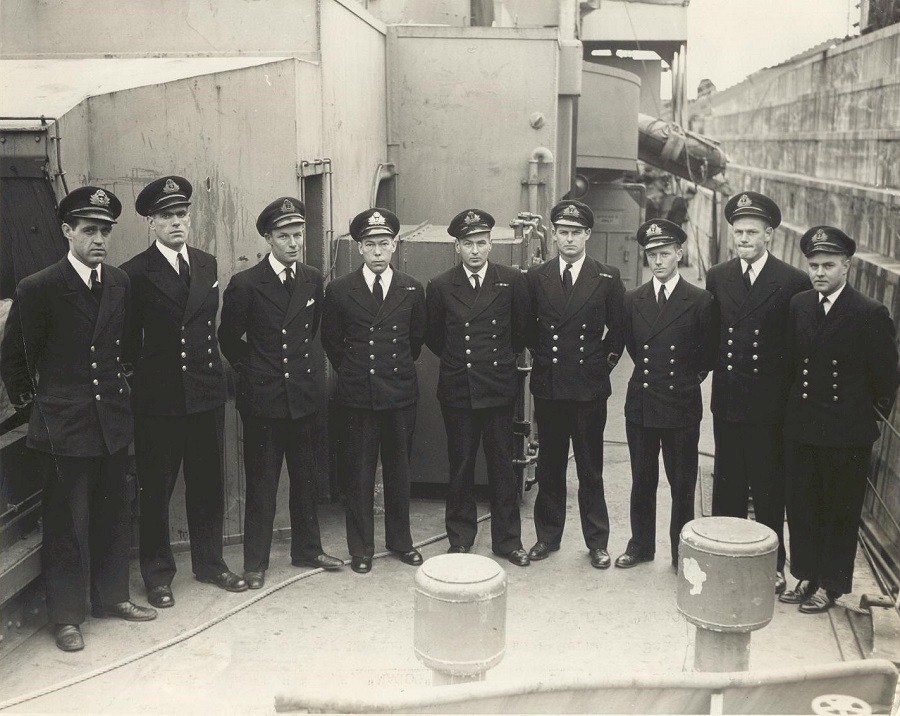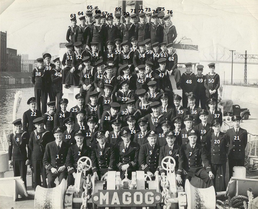 (4) Quick, Lewis Dennis, Lt, RCNR, CO (13) Lapsley, Alfred, CPO, Ordnance Chief (16) Todd, Arthur Norman, A/ERA 4c, RCNVR (21) Hammond, Victor, ERA 3c (28) O'Connor, James Allan (32) Bailey, Barney, HSD (34) Miess, Malcolm, PO.ERA (52) Fuchs, Anton (Tony), RCNVR (66) Murphy, John Ernest From the collection of Errol Stewart Courtesy of Edison Stewart