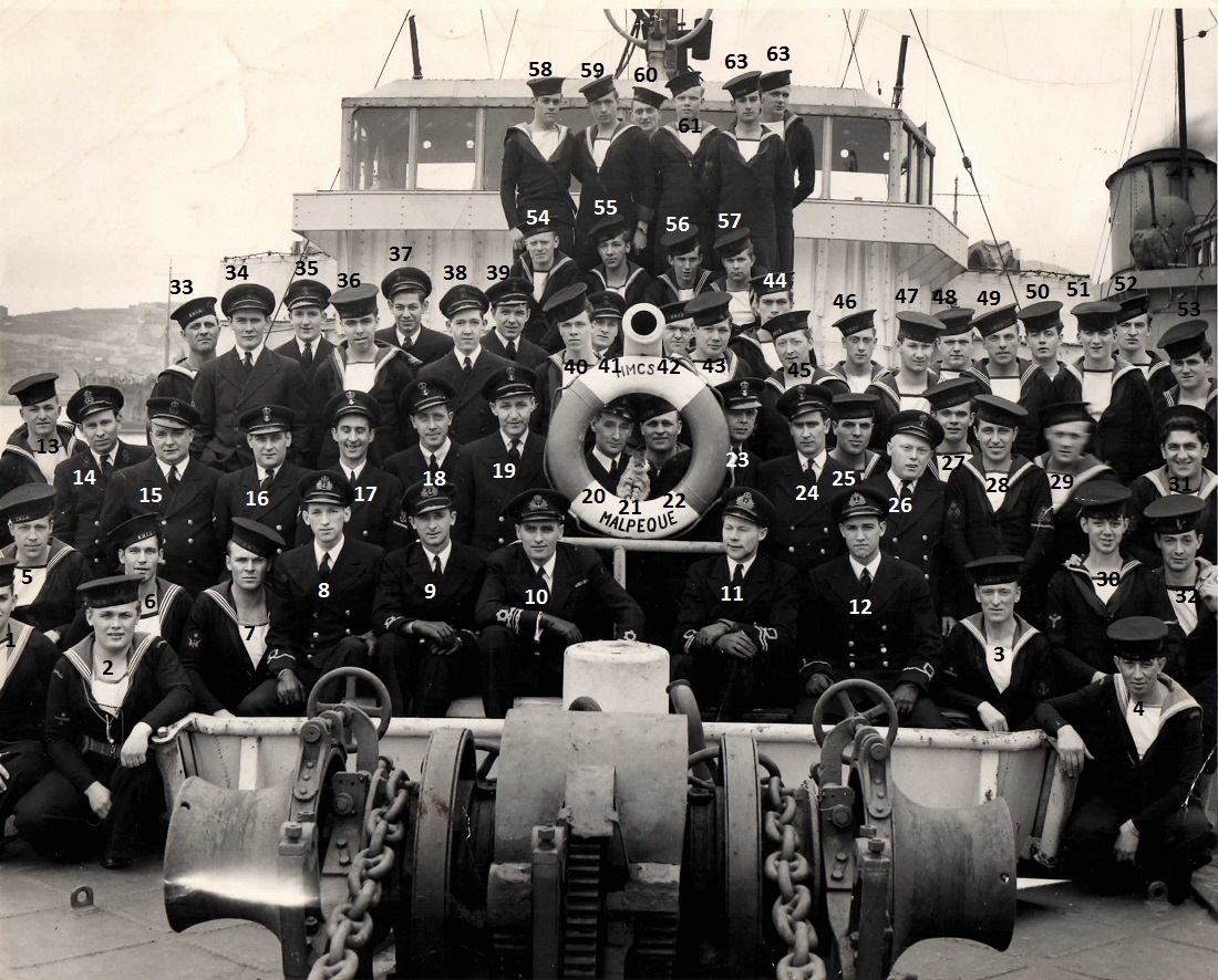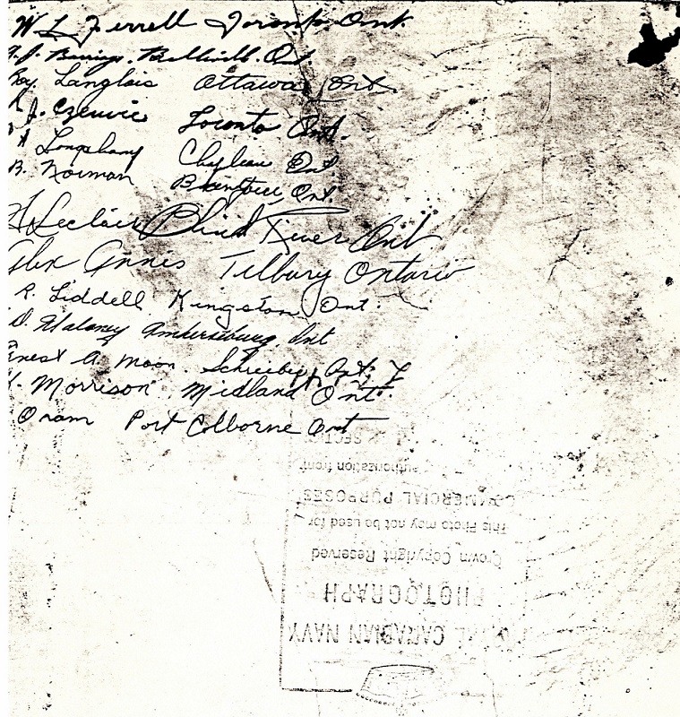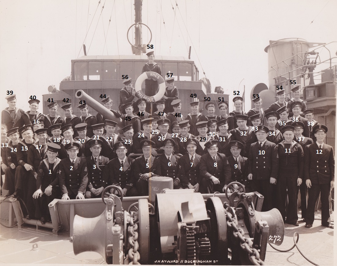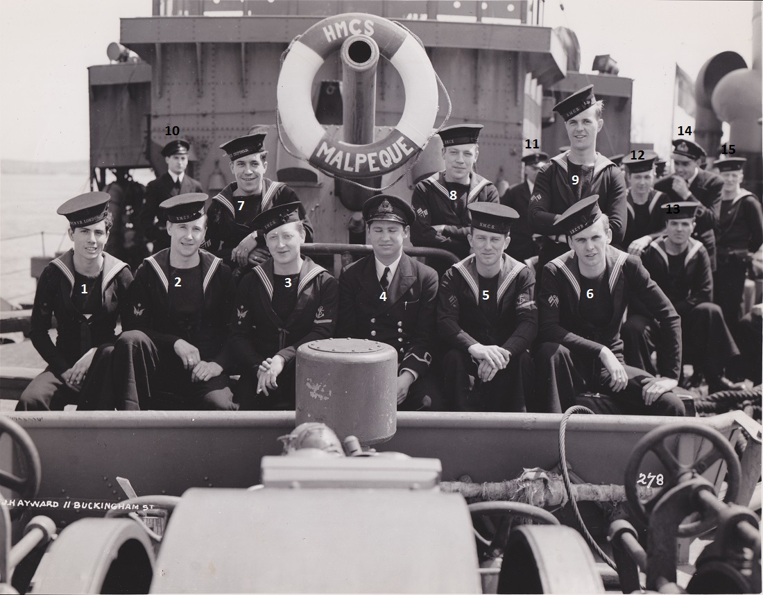 (9) Stevens, Harry Waldron, SLt, RCNR (10) Stacey, William R., A/LCdr, RCNR, CO (12) McCauley, Jack, SLt, RCNVR (19) Chapman, M.E., PO, C.E.R.A. (21) Ship's mascot (24) MacDonnell, Donald, PO (35) O'Hearn, James Murray (40) Hill, James A.