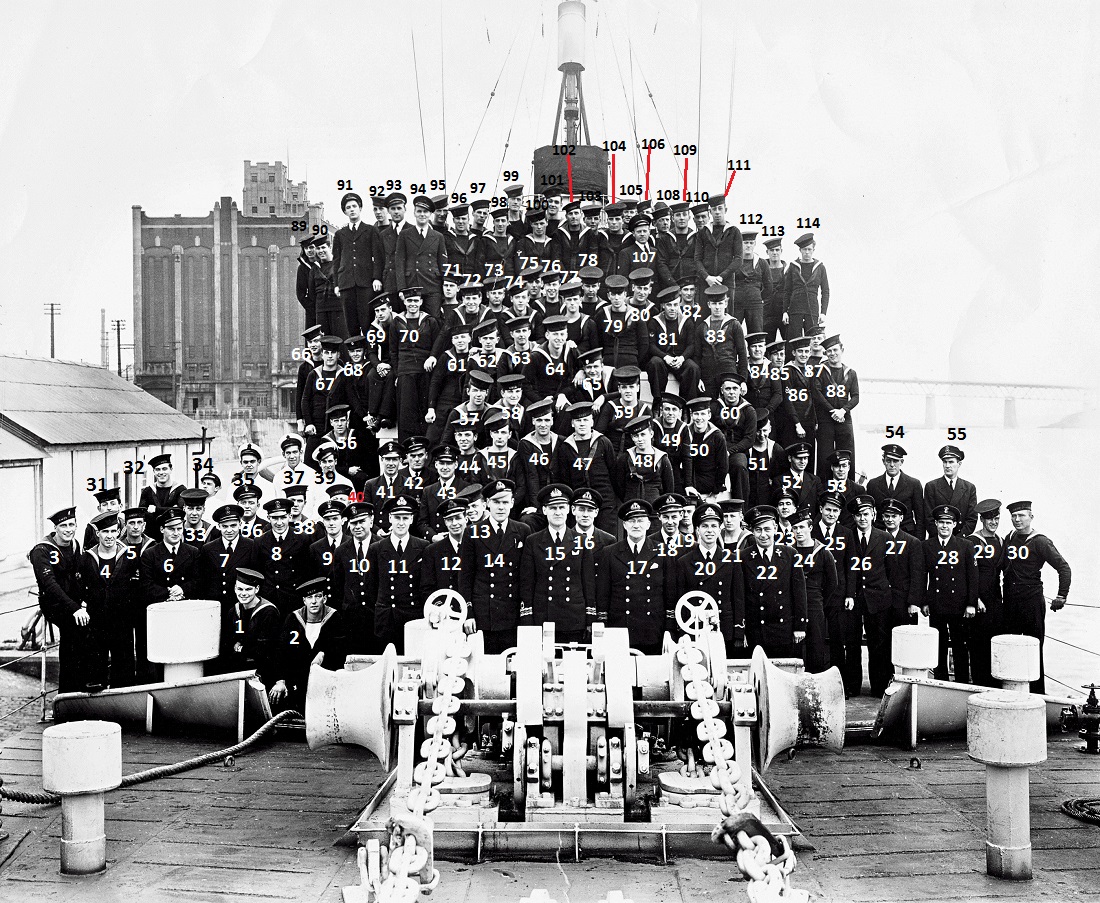 (15) Wolever, Frank Day, Lt (Eng) (16) Jones, Francis J., Lt, RCNVR (32) Gilroy, Robert John, PO.Sig (36) Douglas, John Barry (Jack) (37) Ferguson, Cecil Reginald (44) Swarbrick, Robert Anthony, ABSD (49) Ferguson, Larry, Tel (50) Whitlaw, James McGowan (74) Buchanan, Eldred (91) Abbott, William (120) Anton, John (127) Taylor, Frederick C. (128) Leake, Douglas (136) King, Walter William