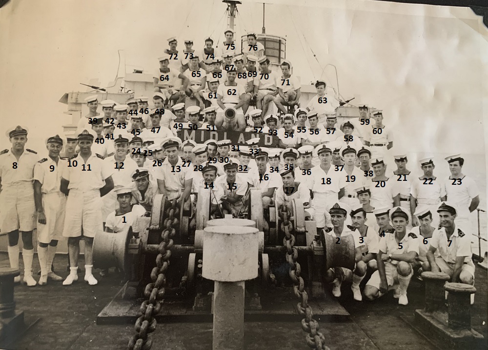 (14) Carrier, Lucien, Stoker PO (16) Farrer, Don Arthur (32) Miles, Ernest (Ernie) (42) Miller, George A. (52) Ellis, Cecil George (Bud) (63) Kelly, Allen (76) Green, Douglas Reid (84) Lizmore, Gordon Homer