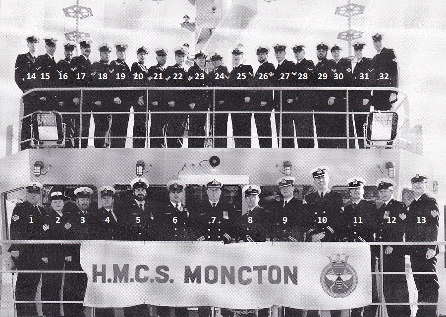 (1) Vengels, Frank (2) Osmond, Jackie (3) Gray, Clayton (4) Lavoie, PO1 (5) Gourlay, PO1 (6) Meadley, Jim, PO1 (7) Greenlaw, LCdr, CO (8) Green, LCdr (9) Botting, Lt (N) (10) O'Leary, Lt (N) (11) Tremblay, Slt (12) Baker, PO2 (13) Cusack, PO2