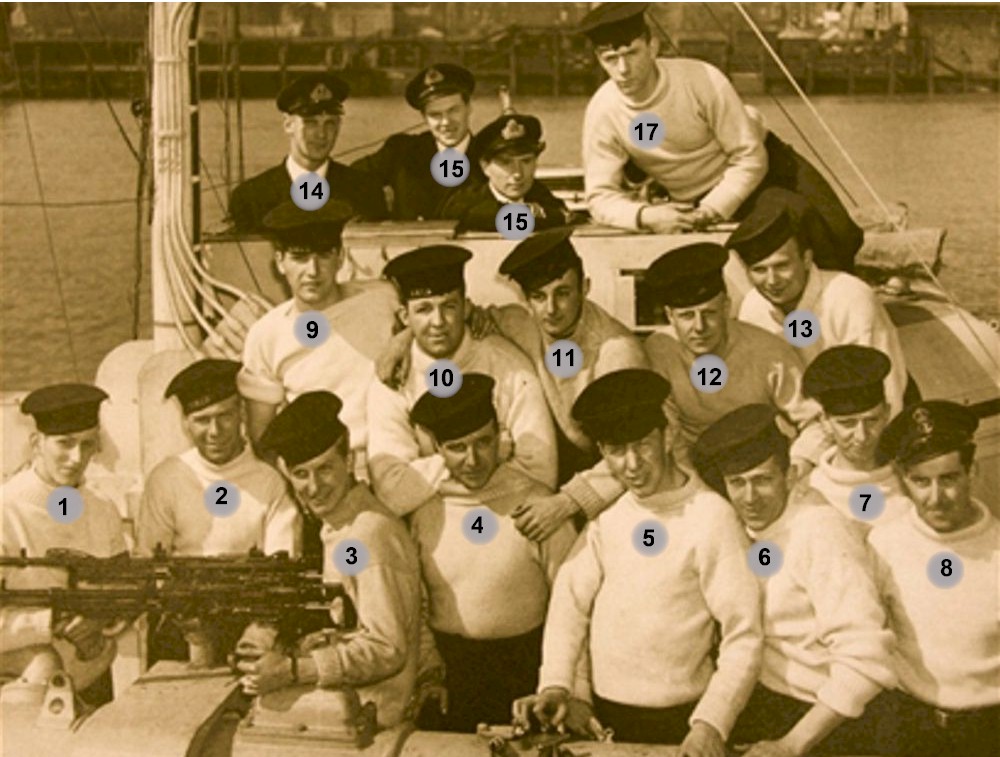 (1) Seaton, Harold, AB, RCNVR, of Chatham, Ont (2) Bushfield, William, AB, of Stratford, Ont (3) Stevens, Roland, AB, RCN, of Windsor, Ont (4) McMahon, Jack, Stoker (M), RCNVR, of Melfort, Sask (5) Reid, William, LS, RCNVR, of Calgary, Alta (6) Simpson, Herbert, AB, RCNVR of Wallaceburg, Ont (7) Roberts, James, Stoker (M), RCNVR, of London, Ont (8) Dawson, Edward, PO MM, RCNVR, of Calgary, Alta