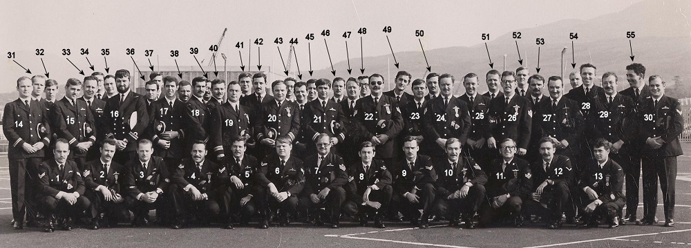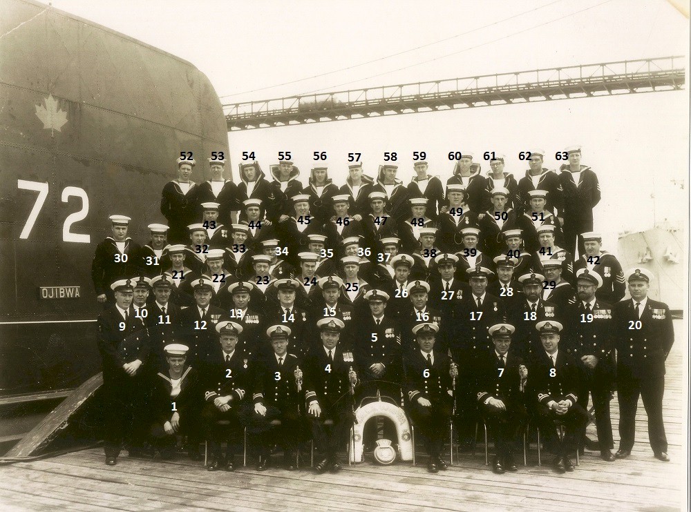 (30) Ranger, Lionel (Tex), CPO2, Chief ET (31) Lake, Rodney, PO2 (32) Bremner, Dennis, LS (33) Andrews, Chris, AB (34) Dufault, J., Cpl (35) Jensen, Ken, LS (36) Drouin, Jim, LS (37) Parry, Alan, LS (38) Hills, Brian, LS (39) Parrott, Brian, LS (40) Burgher, Dave, LS (41) Hickman, Lionel (Bill) (42) Osborne, Earl (43) Rocheleau, L.G., LS (44) Biloski, Morris, LS (45) Jones, Alan, LS (46) Vantkruis, L., LS (47) Perkins, Dave, PO1