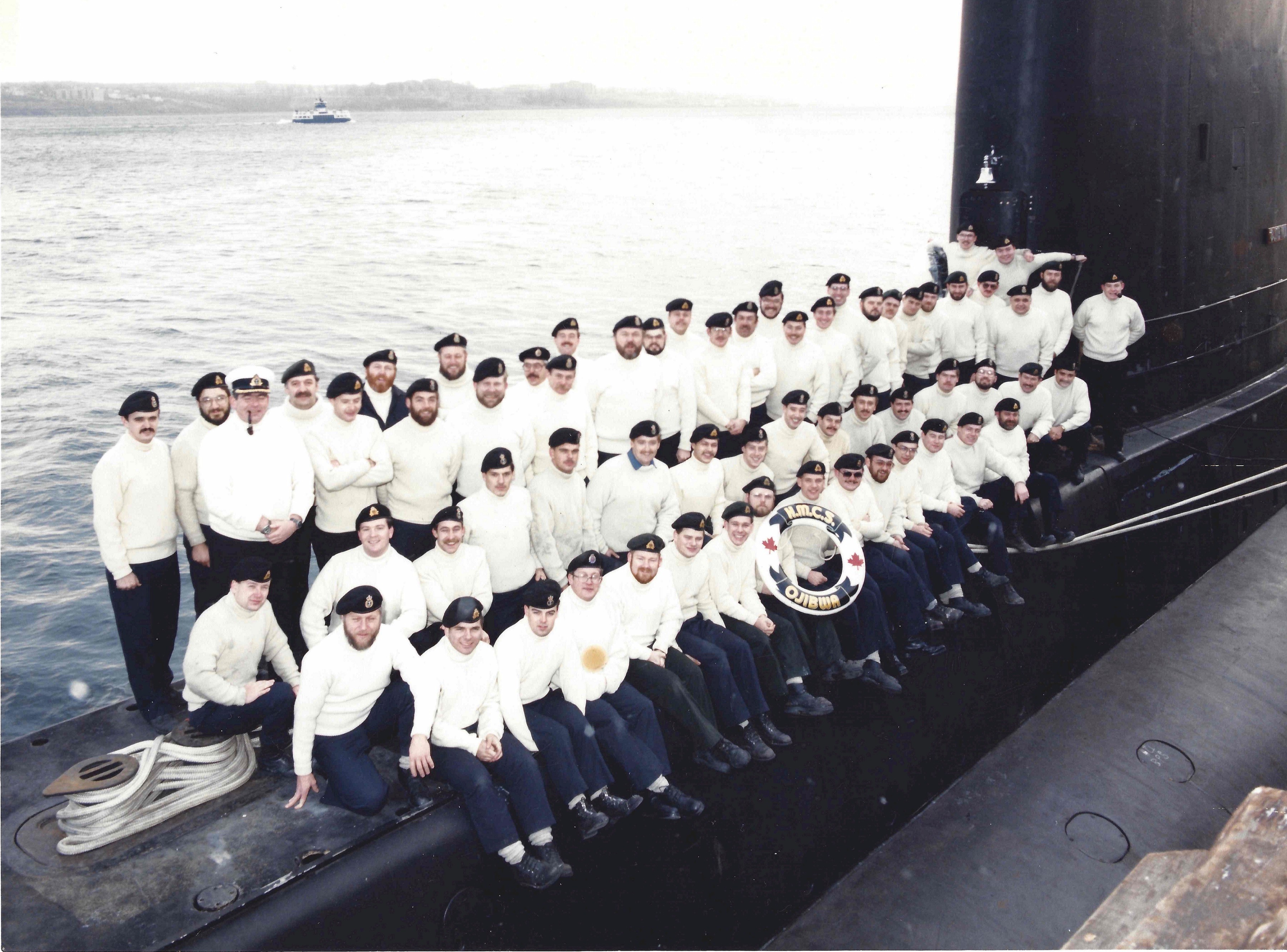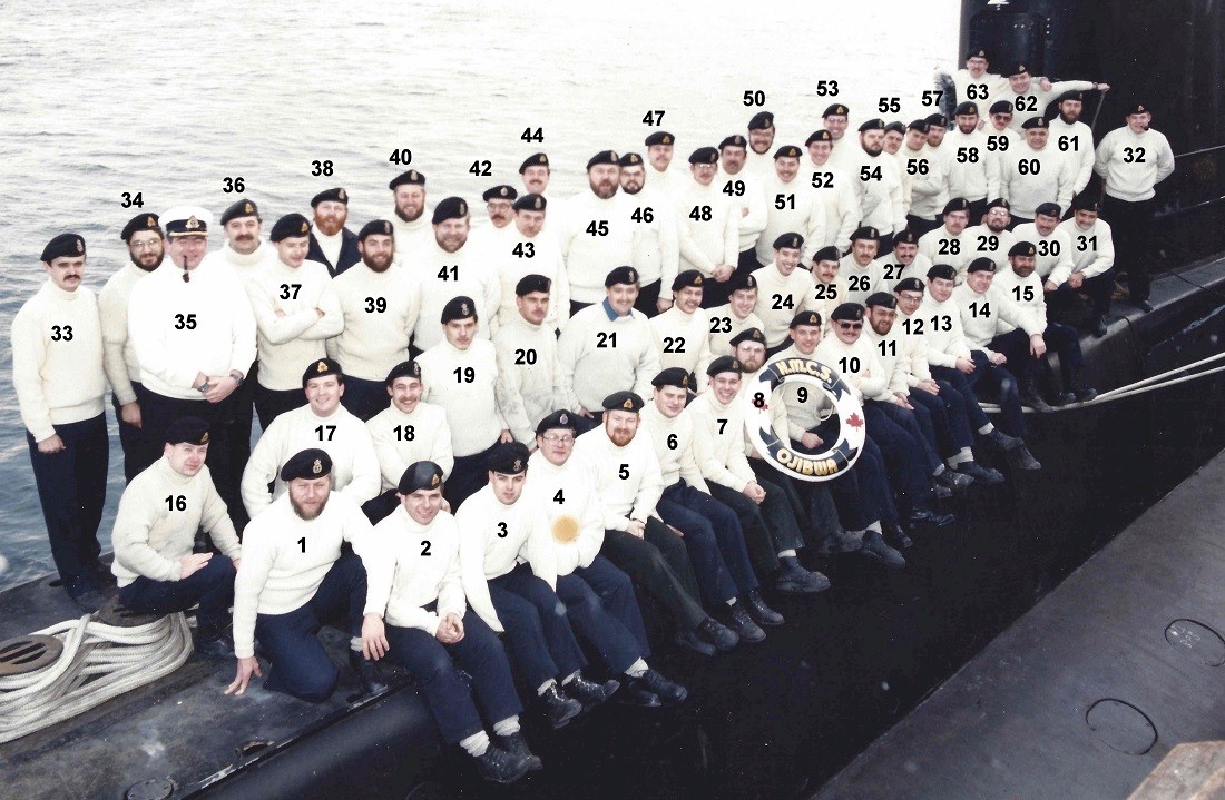 (33) Clahane, John (34) Giannou, Dave (35) MacDonald, A. Drew, LCDR, CO (36) Rollin, Luc (37) Hendry, Peter, OpsO (38) Walsh, J.J., CERA (39) Slack, John (40) Tovey, Brum (41) Fraser, Robbie (42) Gendron, Claude, Chief Cook (43) Haddock, Joe (44) Craven, Mike (45) Chatham, Terry, CSE Coord (46) Soper, Mark Lt (47) Benoit, Darrel (48) Clory, Joe (49) Toole, Cary "Spud" (50) Malcolm, Gord (51) Hart, Doug, Lt. (52) Percy, Tom, Lt, EO (53) Finn, Pat, Lt, CSEO (54) Harris, Bill (55) Delorme, Chris (56) Wenzel, Willy (57) Gregoire, Frank (58) Hewitt, Jim (59) Northrup, Jim (60) Doutre, Gilles, CET (61) Fyfe, Steve (62) Mulholland, Dermot. Lt (63) Halle, Marcel