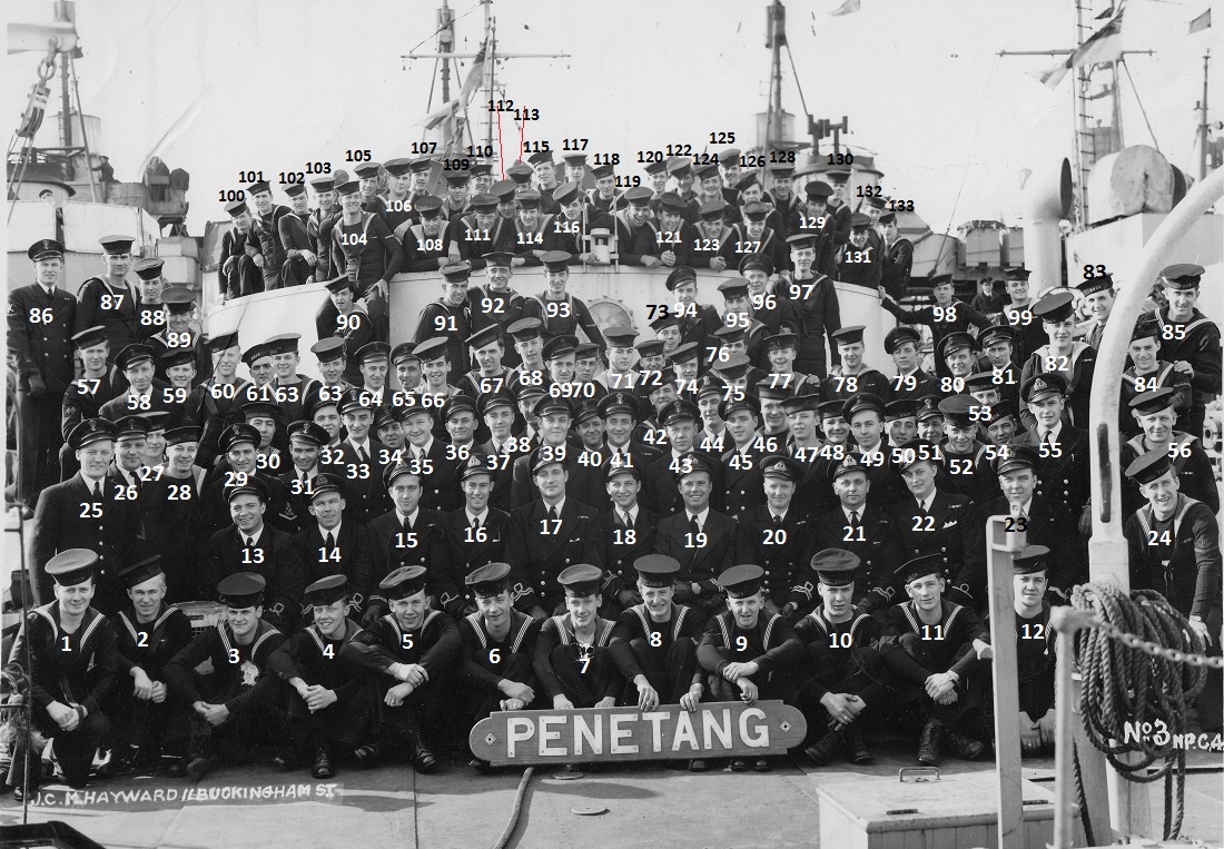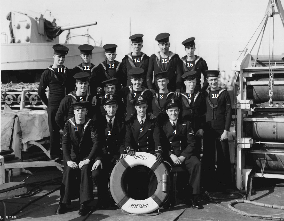 (2) Christenson, Robert James  (15) Nordlund, Hough Arnold, Lt  (21) Dick, Sidney Alexander, Lt, RCNVR  (79) Durand, Orland Regis, Stwd  (83) Hutchings, Wallace Balfour (Wally)  (85) Lefurgey, Alex  (91) Hamilton, John Renner  (100) McLeod, Duncan