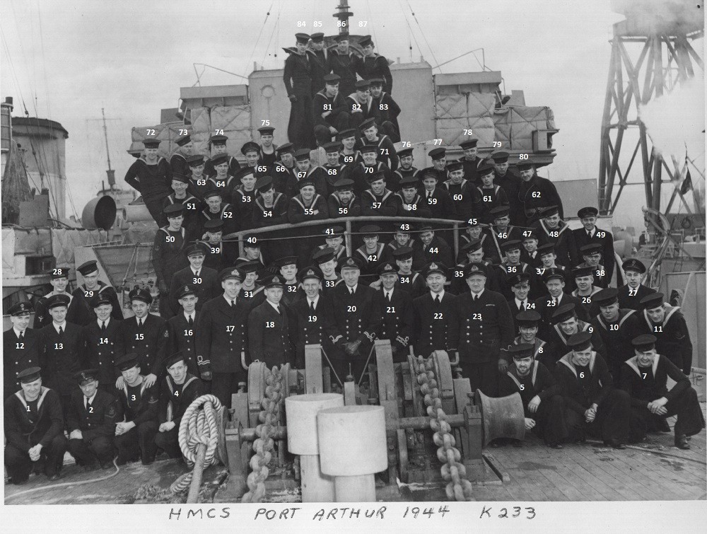 HMCS PORT ARTHUR K233 1944 From the collection of PO John Wheelton Courtesy of Tony Skokun Website: Dede's family Genealogy Click on the above photo to view a larger version without numbers