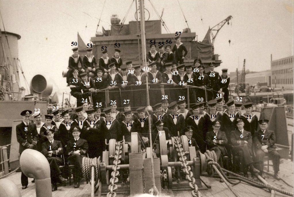 (2) Gibson, Clarence, CPO (5) Chalmers, Charles (12) Wheelton, John, PO (13) Ince, William (15) Greenwood, Howard Hamilton (17) Miller, Scott (18) Graham Lawson, Lt (20) Chisholm, Kenneth Taylor, C.O. (21) Wilson, William (23) Palmer, Clifford, War (E) (28) Clegg, Harold (50) Lyons, Douglas B. (57) Boileau, Armand (61) Honey, Gilbert L. (62) Goulet, Eugène (71) Reeves, John Joseph (82) Burns, Harvey Douglas