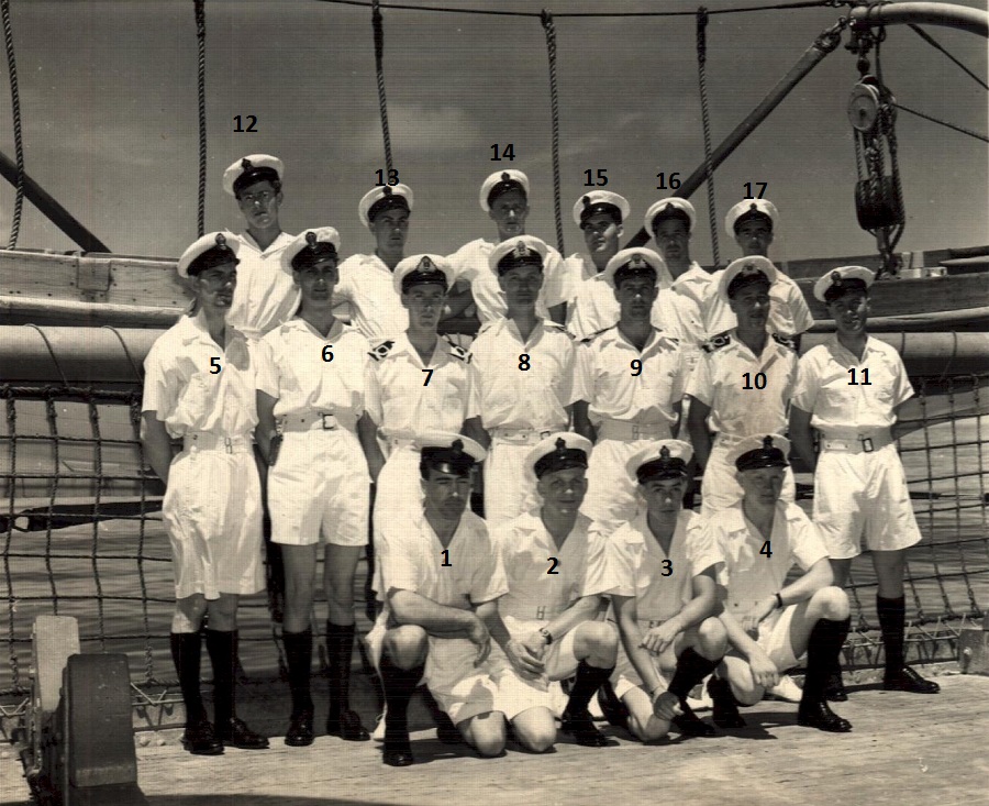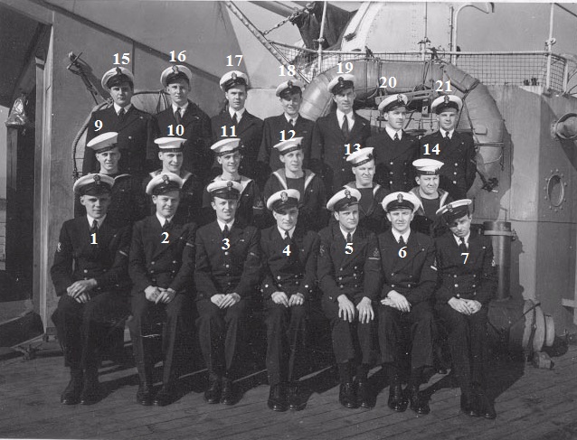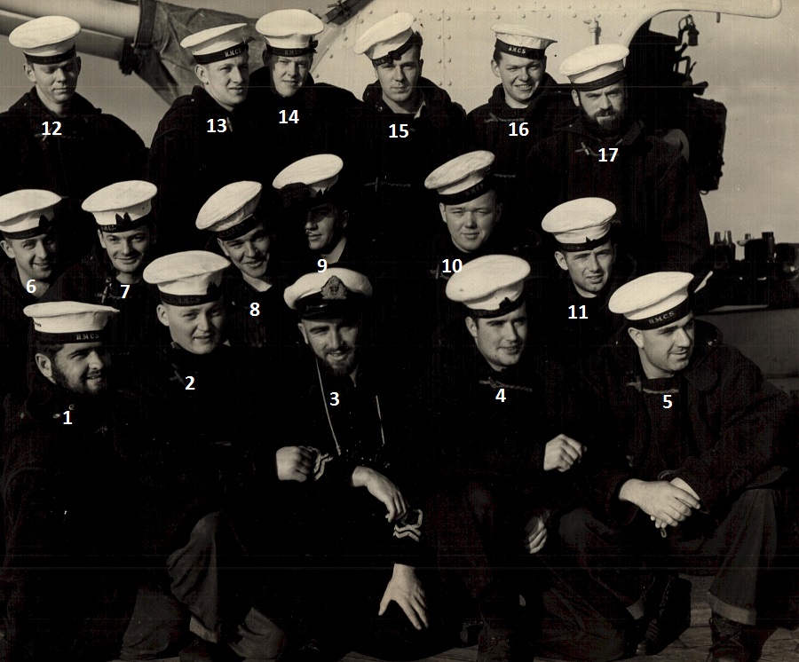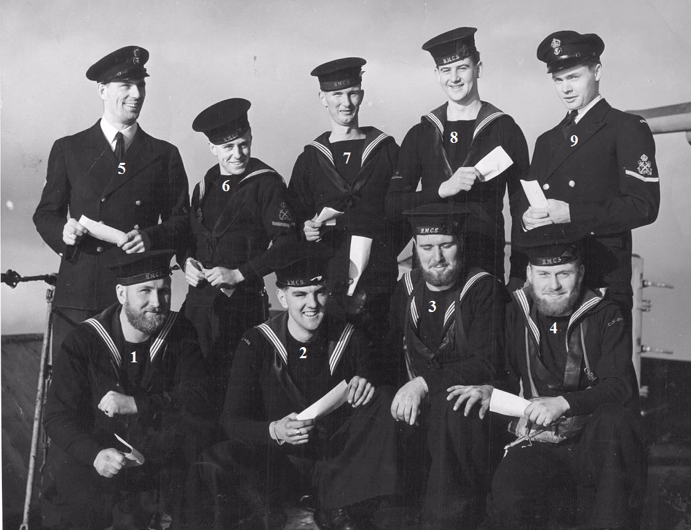 (1) Mauro, Earl, AB of Sault Ste Marie, ON (2) Jupp, Edward, AB, of Montreal, QC (3) Fricke, Laurence, Lt, of Montreal, QC (4) Reid, James A., LS, of Edmonton (5) Cordrey, Harry, AB, of Brantford, ON