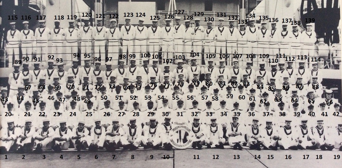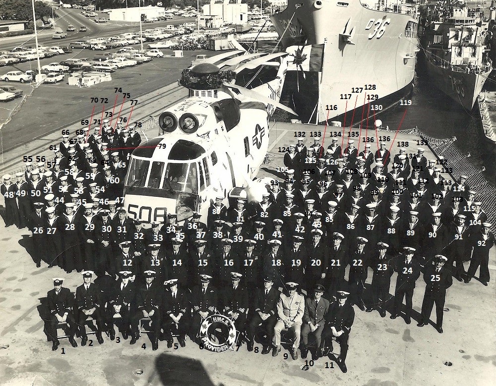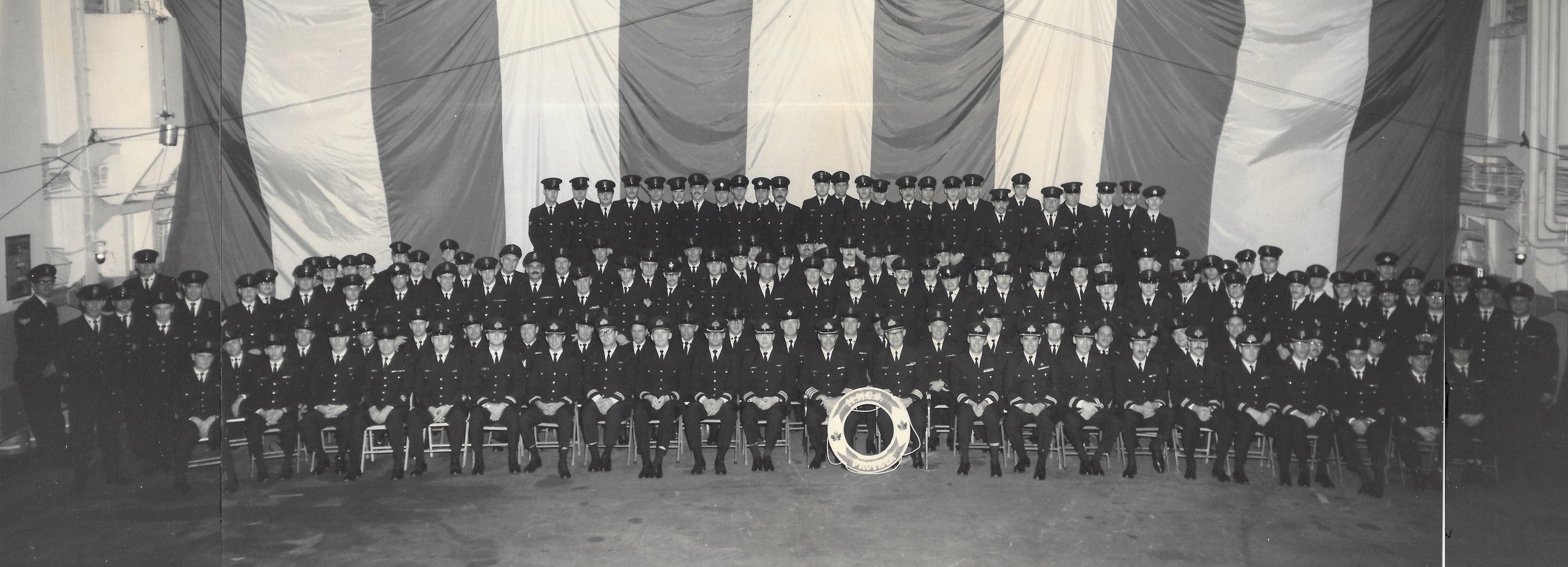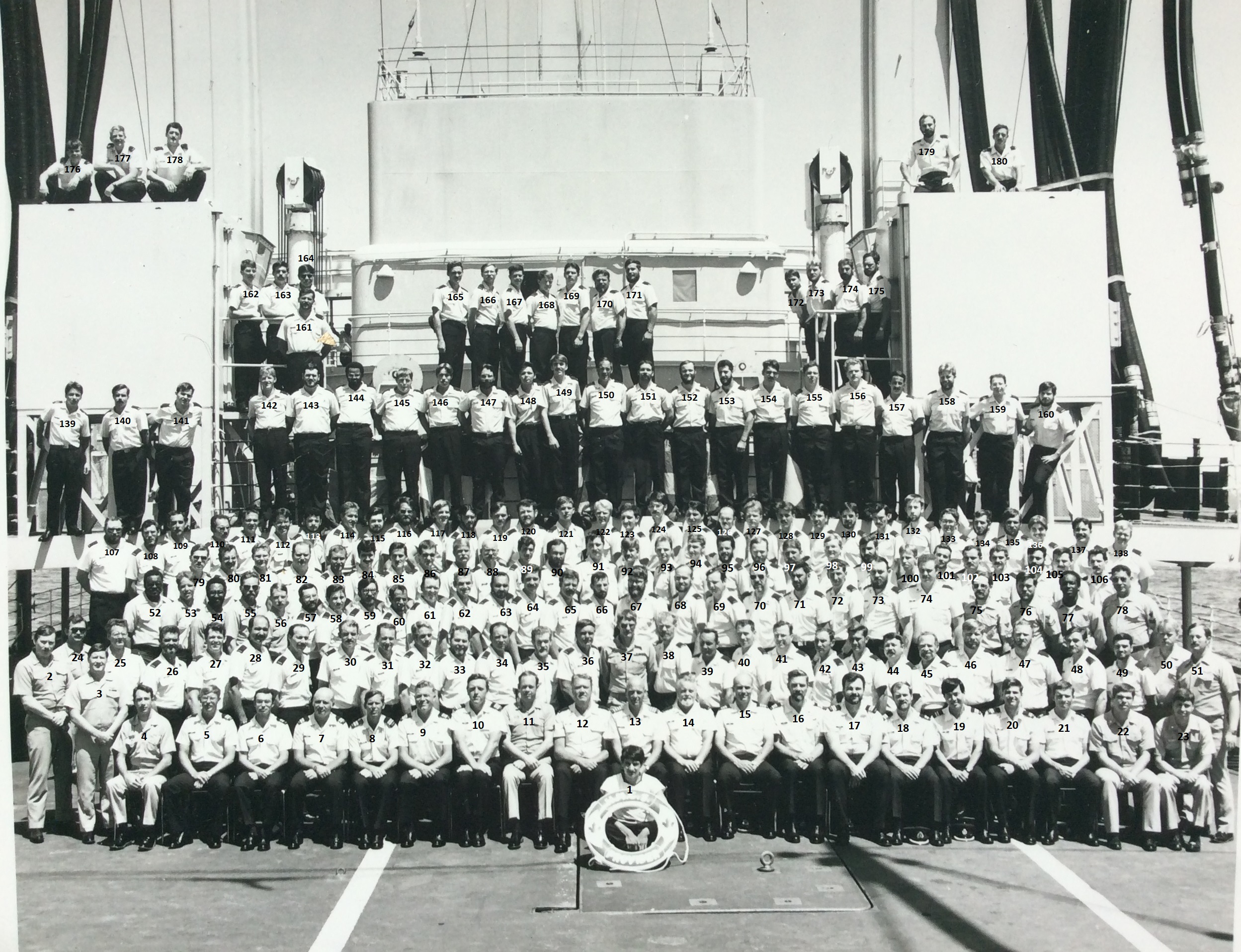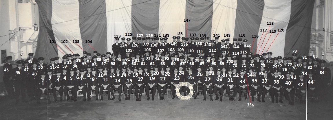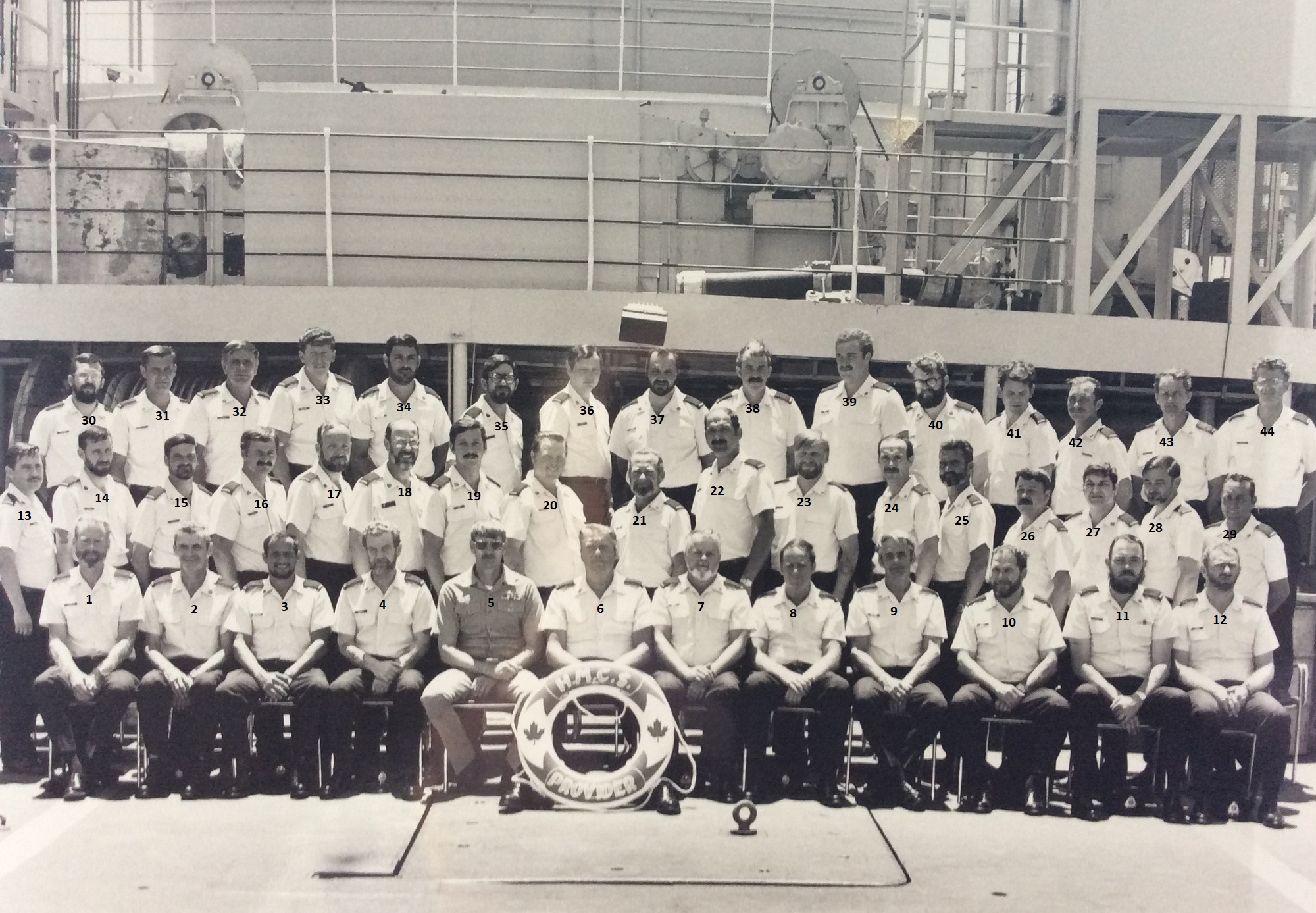 (4) Gillies, Hugh, Yeoman (6) Chan, Victor, HT (9) Bendall, Don, HT (23) Crickard, F., Capt (N), CO (24) unknown C2CK (25) Birch-Jones, Cdr, XO (30) Hunt, PO (32) Spooner, Sid, PO (33a) Stuppiello, Robert, OS (34) Torris, Ralph, P2ET (35) Hlasny, Steve, P2LT (41) Bradley, Ralph (42) McDougall, Al, CERA (45) Stewart, Allen, Pay Writer (50) Cox, Robbie, LS.WS (55) Brydon, Glenn, WO(A), Met Tech (56) Holliston, H.A., C2ER (57) Rombough, Wallace (Wally), PO (58) Black, PO (59) McLellan, W., P2CK (60) Yates, Arnie, BN (63) George, Andy, Sup Tech (64) Knox, Gordie, BN (70) Cox, LS (76) Cryer, John, HT (78) Desjardin (Desi), AB (81) Crook (Doc), OS (82) Worthy, Norman, OS (84) Negrich, Ray, C1SG, Cox'n (89) Verhuel (Dutch), P2ER (96) Bertrand, Rick, Sup Tech (108) Beasley Doug, Mar Eng (109) Kinsey, Dave, AB.ER (124) Bonde, Ralph, BN (133) Bedard, Mario, BN (137) Wilsher, Cecil, BN (139) Reid, Harold, OS (140) Therrien, Jacques, SG