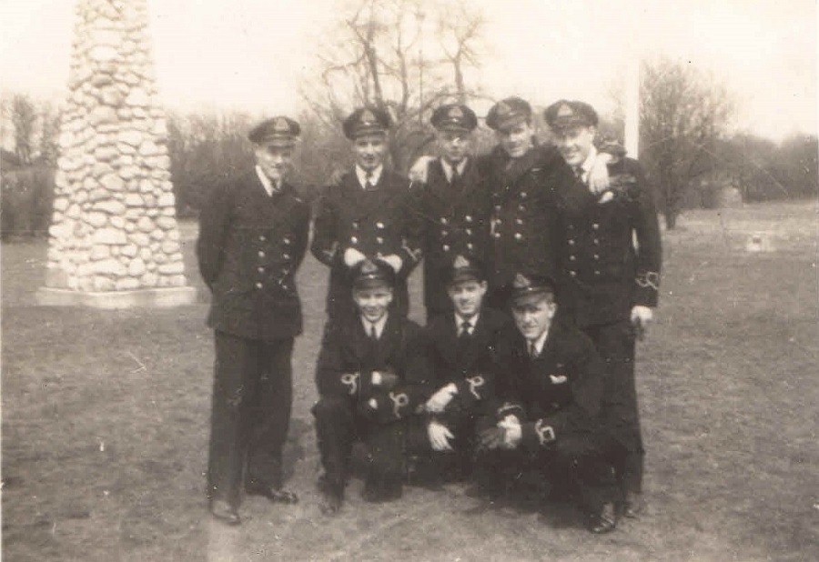 Officers of HMCS REINDEER Z08 Back row: Burgess, Gord 1st on left; Drew, Ronald 3rd from left From the collection of Ronald Drew, Sub-Lieutenant, RCNVR Courtesy of Gordon Drew