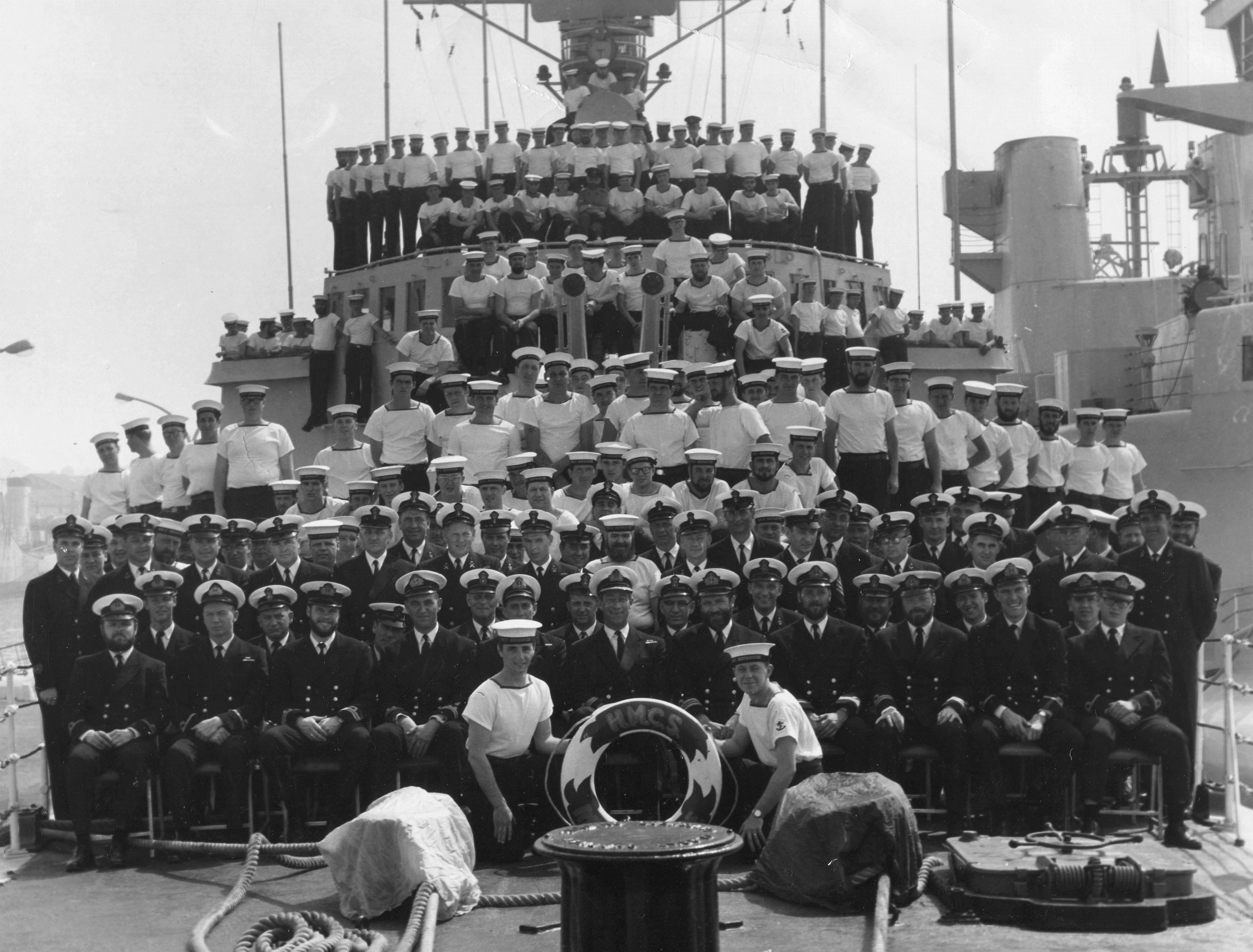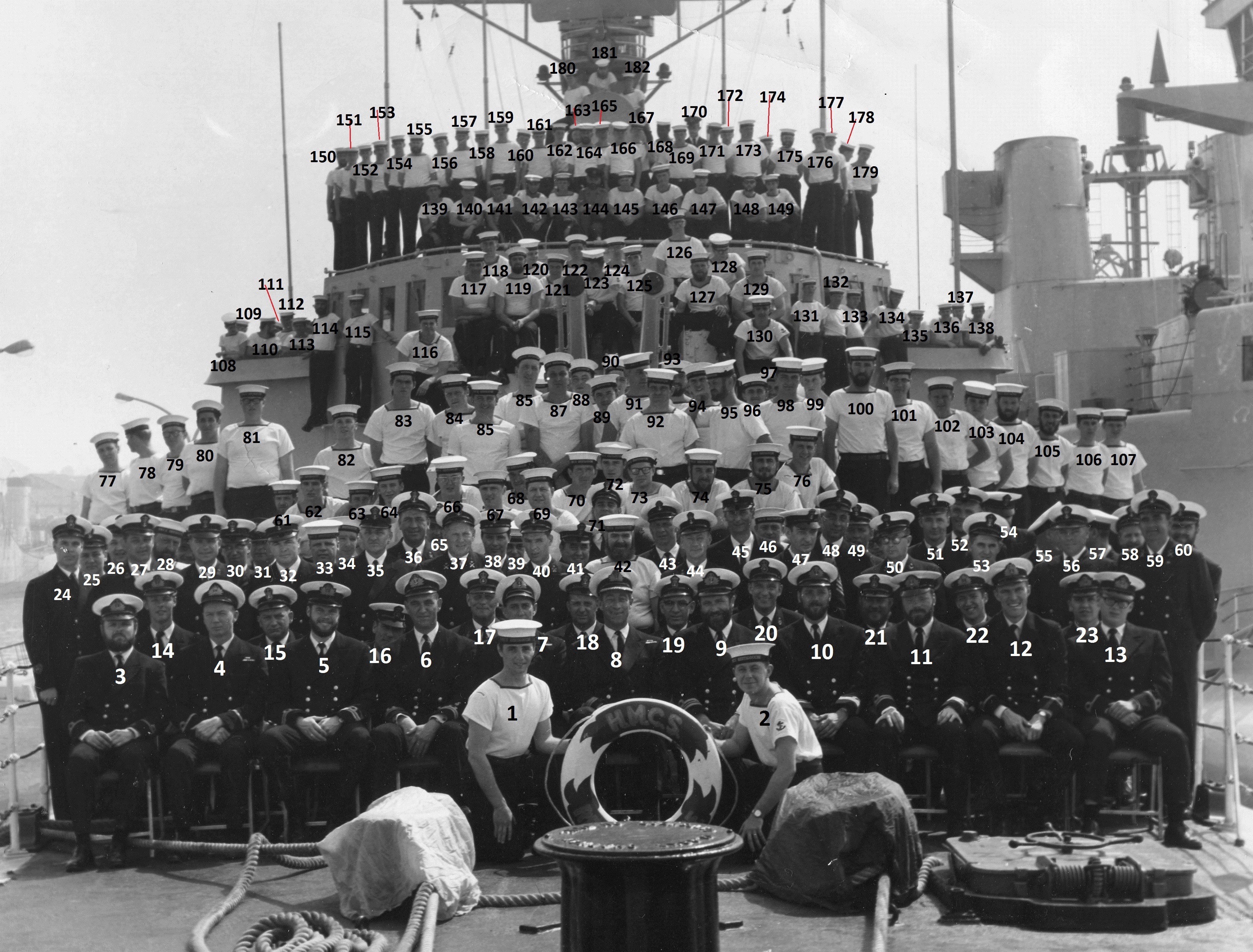 (3) Woolner, Wayne, Slt (4) Christenson, Will, Cmd O, DeckO (5) MacDougall, Dave?, Lt, NavO (6) Young, Michael, Lt, Weapons O (7) Smythe, Dick, Lcdr, XO (8) McCullough, Paul, Cdr, CO (9) Davies, Hal, LCdr, OpsO (10) Legaarden, John, Lt (11) Burlett, Jim, Slt (12) Coates, Bruce, Slt (13) Parker, Ian (14) Tennant, Bruce, Slt (22) Reddy, Jim, Slt (23) Lajeunesse, Gary, Slt (82) LaChance, Yvon, Stoker (87) Baird (?poss) (92) ____, René (99) Doucet (147) Dunnigan, Neil, LS.RM